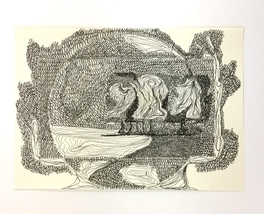 - L’oeuvre était dans une chemise avec plusieurs autres oeuvres. La chemise portait la mention suivante : « Elle, Lui, « Arbres-Planètes » 1977 Dessin au stylographe », voir no d’inventaire 3888.
