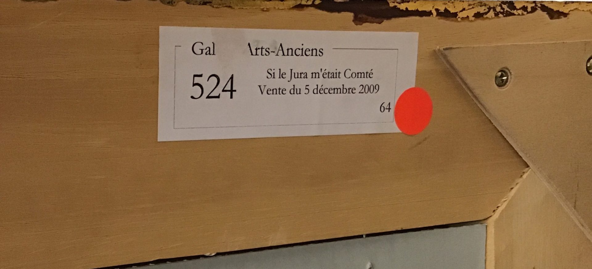 - Etiquette au dos indiquant la vente au enchères de la galerie Arts Anciens "Si le Jura m'étais comté" de 2009, lot n° 524.