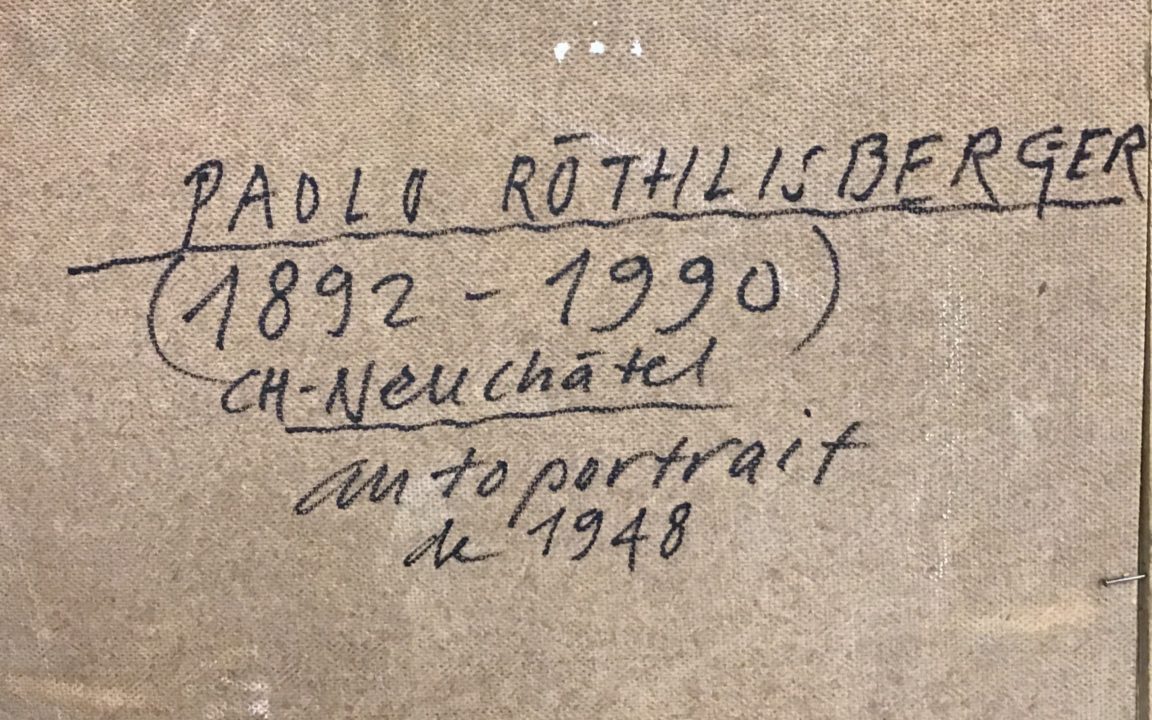 Autoportrait Artiste RÖTHLISBERGER Paulo Numéro d'inventaire FAA-RP-5238 Titre Autoportrait Année 1948 Technique / Support Huile, Bois aggloméré Catégories Figure Signature / Datation « P.R. 48 » bd Remarques - Titre et date de l’oeuvre mentionnés au verso (cf photo) - Le cadre comporte des petites tâches de saletés Agrandir l'image Découvrez l'artiste RÖTHLISBERGER Paulo Neuchâtel (CH) 5 mai 1892 / 1990 Fonds géré par la FAA Consulter sa fiche Images complémentaires RÖTHLISBERGER Paulo – Autoportrait 1948 – Huile, Bois aggloméré – Figure