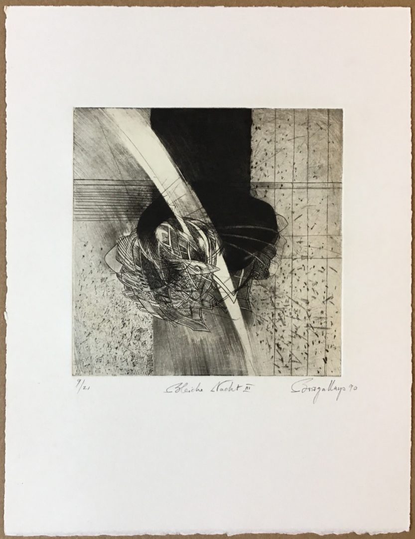 Bleiche Nacht III Artiste BOISGALLAYS Maya Numéro d'inventaire FAA-BM-6162 Titre Bleiche Nacht III Disponibilité Œuvre inaliénable Année 1990 Technique / Support Burin, Papier, Manière noire Catégories Non figuratif Signature / Datation « Boisgallays 90 » bd Remarques - Une épreuve titrée, signée, datée et justifiée 9/21 Agrandir l'image Découvrez l'artiste BOISGALLAYS Maya Montreux (CH, F) 1949 Peinture, Peinture à l'huile, Xylographie, Lithographie, Gravure, Dessin, Aquarelle Fonds géré par la FAA Consulter sa fiche