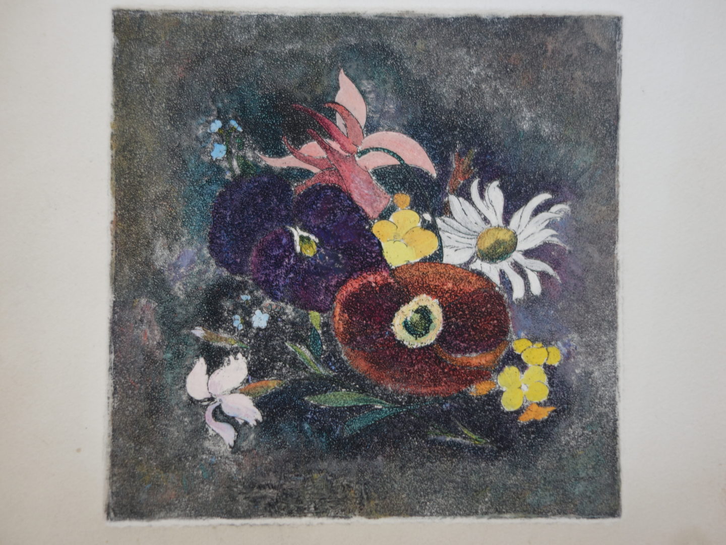 Bouquet de fleurs Artiste CARRARD-KOHLER Marie-Louise Numéro d'inventaire FAA-CML-3401 Titre Bouquet de fleurs Année 1969 Dimensions sur chassis 20.5x22 cm Technique / Support Eau forte, Aquatinte Catégories Nature morte Remarques - épreuve d'essais sans signature ni justification - journal d'emballage de la plaque daté 1969 Agrandir l'image Découvrez l'artiste CARRARD-KOHLER Marie-Louise Châtelard Orbe (CH) 5 septembre 1901 / 1 décembre 1981 Fonds géré par la FAA Consulter sa fiche
