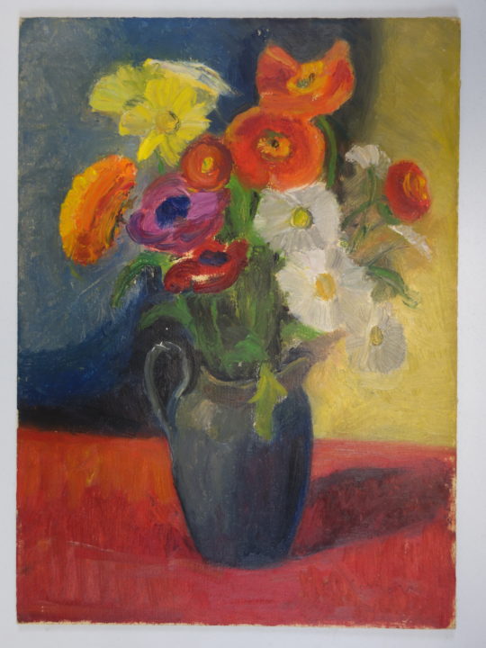 Bouquet de fleurs dans une cruche Artiste CARRARD-KOHLER Marie-Louise Numéro d'inventaire FAA-CML-3085 Titre Bouquet de fleurs dans une cruche Dimensions sur chassis 33x24 cm Technique / Support Huile, Carton Catégories Nature morte Signature / Datation "M. L. Carrard" bd Remarques - titré sur une étiquette collée au dos - "achat 4.10.2004" sur étiquette collée au dos, écriture de Jean Menthonnex Agrandir l'image Découvrez l'artiste CARRARD-KOHLER Marie-Louise Châtelard Orbe (CH) 5 septembre 1901 / 1 décembre 1981 Fonds géré par la FAA Consulter sa fiche