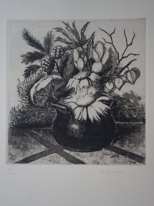 Bouquet Fleurs Artiste CARRARD-KOHLER Marie-Louise Numéro d'inventaire FAA-CML-3395 Titre Bouquet Fleurs Année 1957 Dimensions sur chassis 43.5x34.5 cm Technique / Support Aquatinte Catégories Nature morte Signature / Datation "ML Carrard" bd Remarques - 1 épreuve justifiée 1/20 - Titre manuscrit sur le journal d'emballage de la plaque, daté 1957 Agrandir l'image Découvrez l'artiste CARRARD-KOHLER Marie-Louise Châtelard Orbe (CH) 5 septembre 1901 / 1 décembre 1981 Fonds géré par la FAA Consulter sa fiche