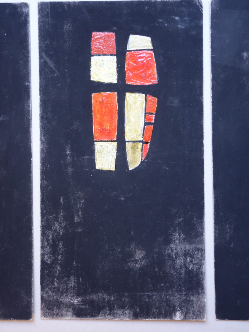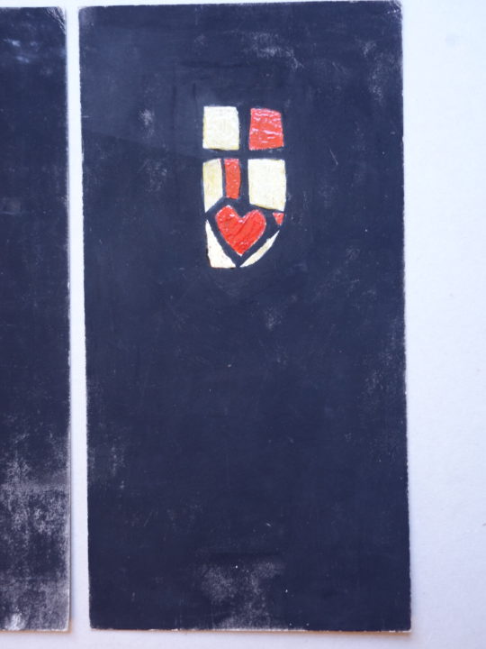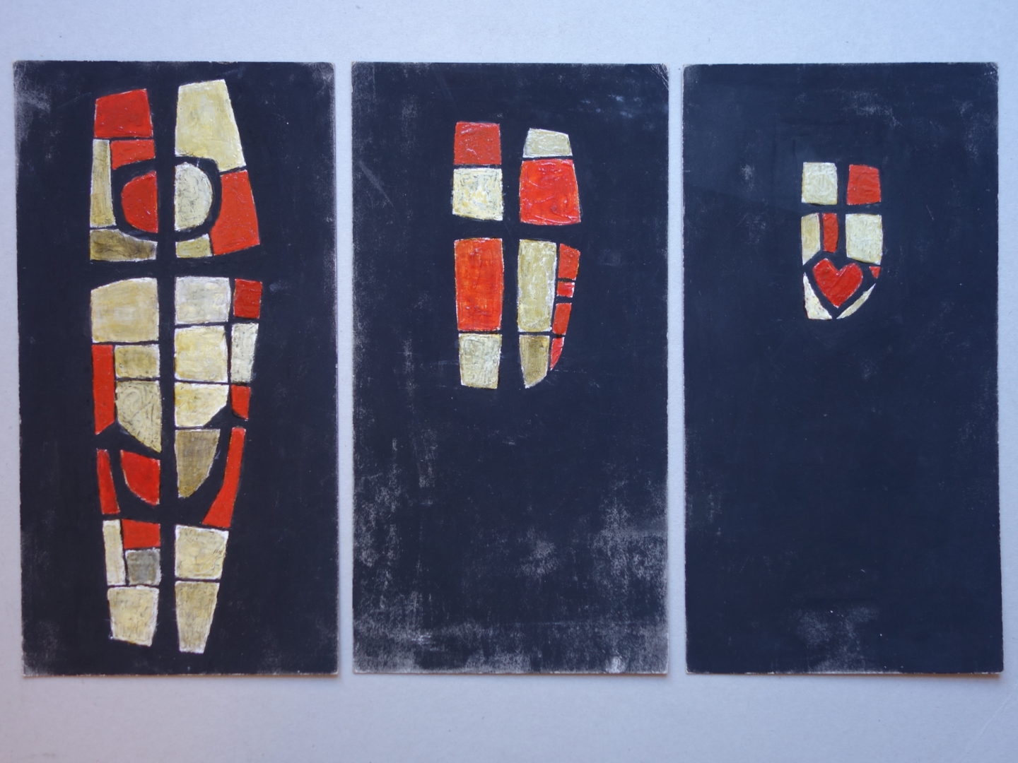 Lun des 3 projets porte l'inscription: ""Fait partie de 3 dalles de verre / représentant: la foi / l'espérance / la charité