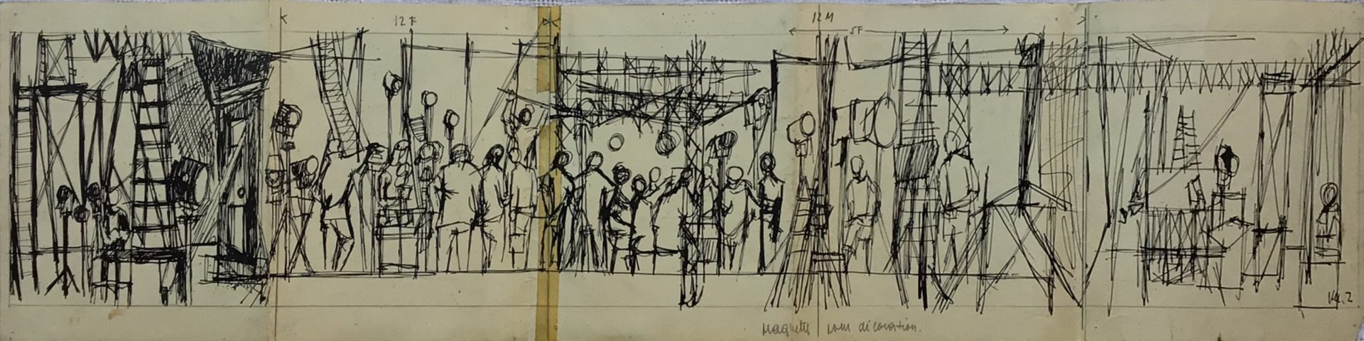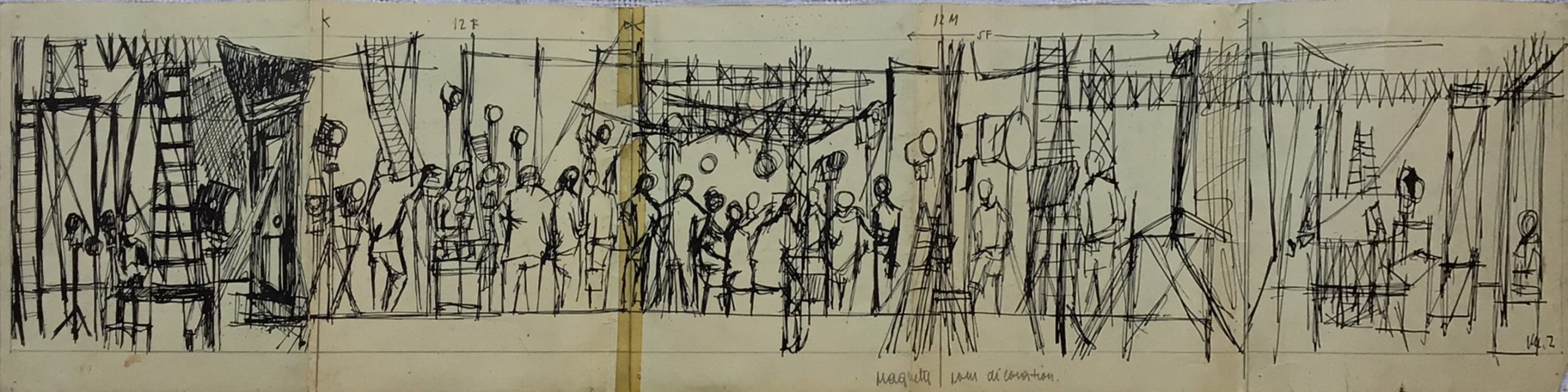 - 1 maquette à l’encre de chine (19x76cm) signée, avec mention « Maquette pour décoration » bm et d’une répartition métrée du projet ; au verso, présence d’un dessin à l’encre abandonné et coupé au profit de la maquette.