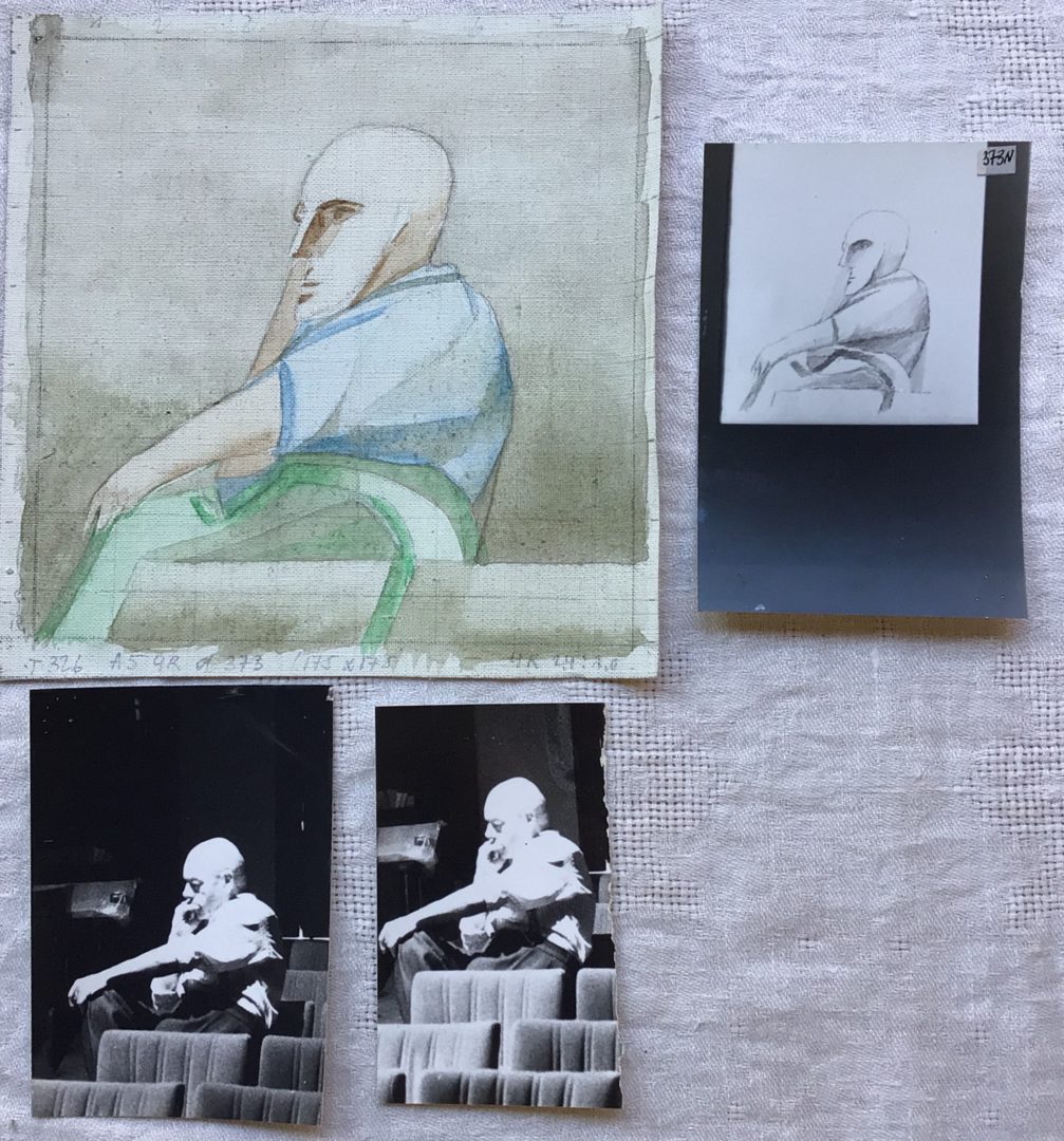 - 1 toile (détail) « inachevée » (cf lettre en annexe) avec une mise au carreau numéroté. Cette toile est accompagnée d’une enveloppe avec mention « Zardi » contenant 2 photographies d’un homme et une photographie d’un dessin (du même sujet)