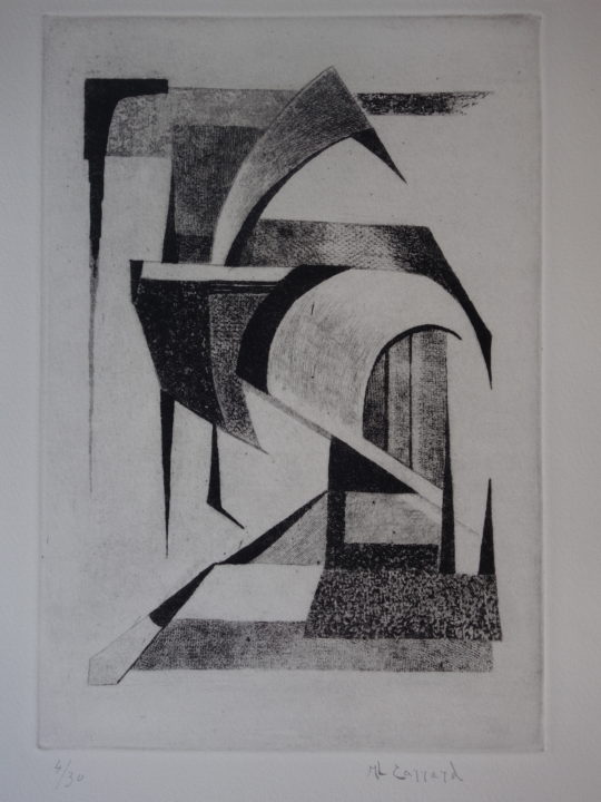- Cas compliqué qui semble témoigner des incertitudes au début des compositions absstraites. Sur le journal d'emballage de la plaque, on lit: "construction" env. 1960 /4 tirages / devenu imbrication / tiré 1976