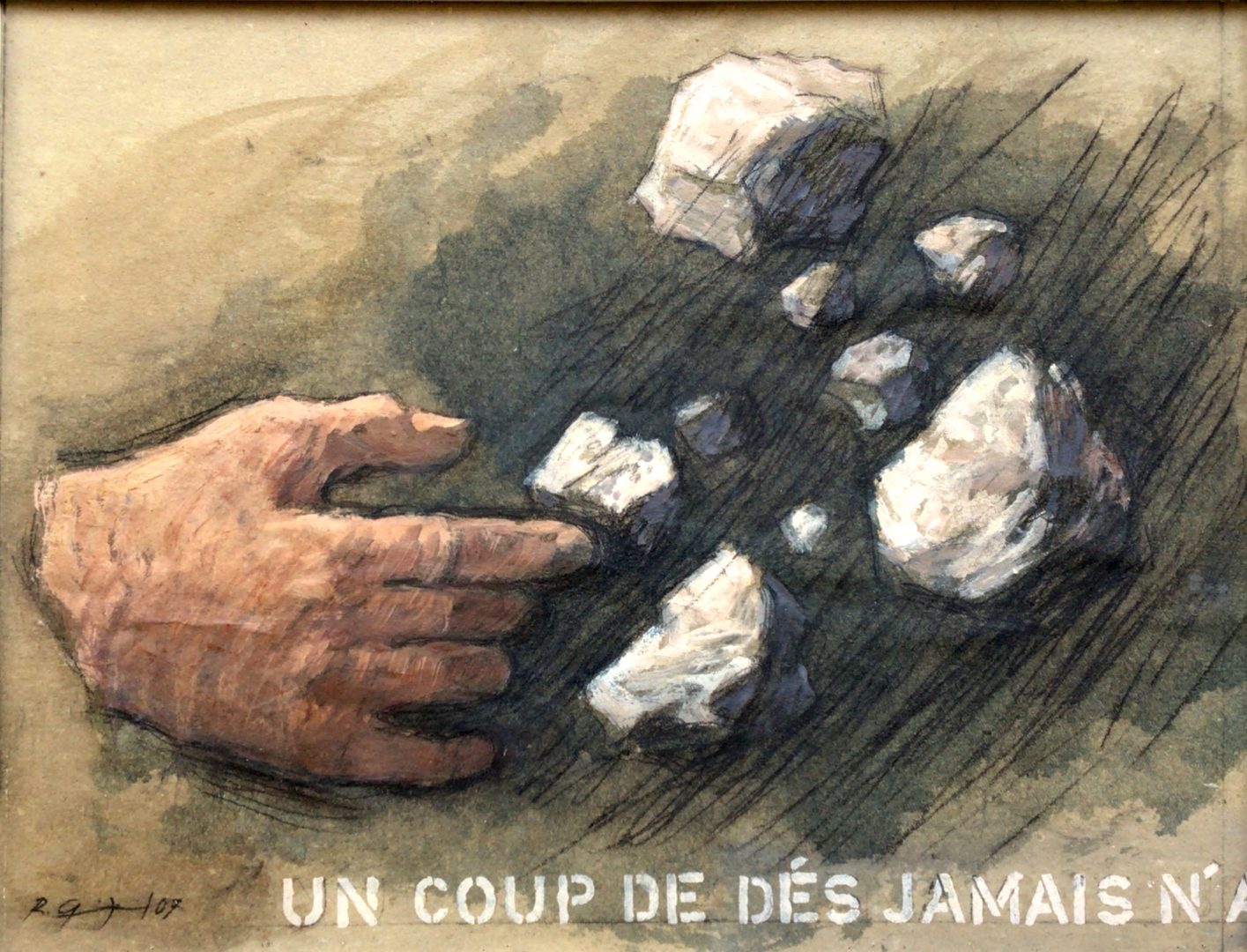 - Titre donné par l’artiste, d’après l’aphorisme de Mallarmé de 1817 : « Un coup de dés jamais n’abolira le hasard »