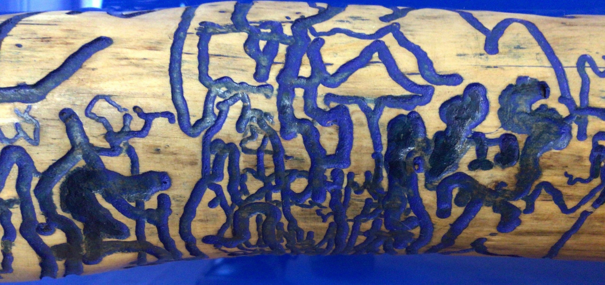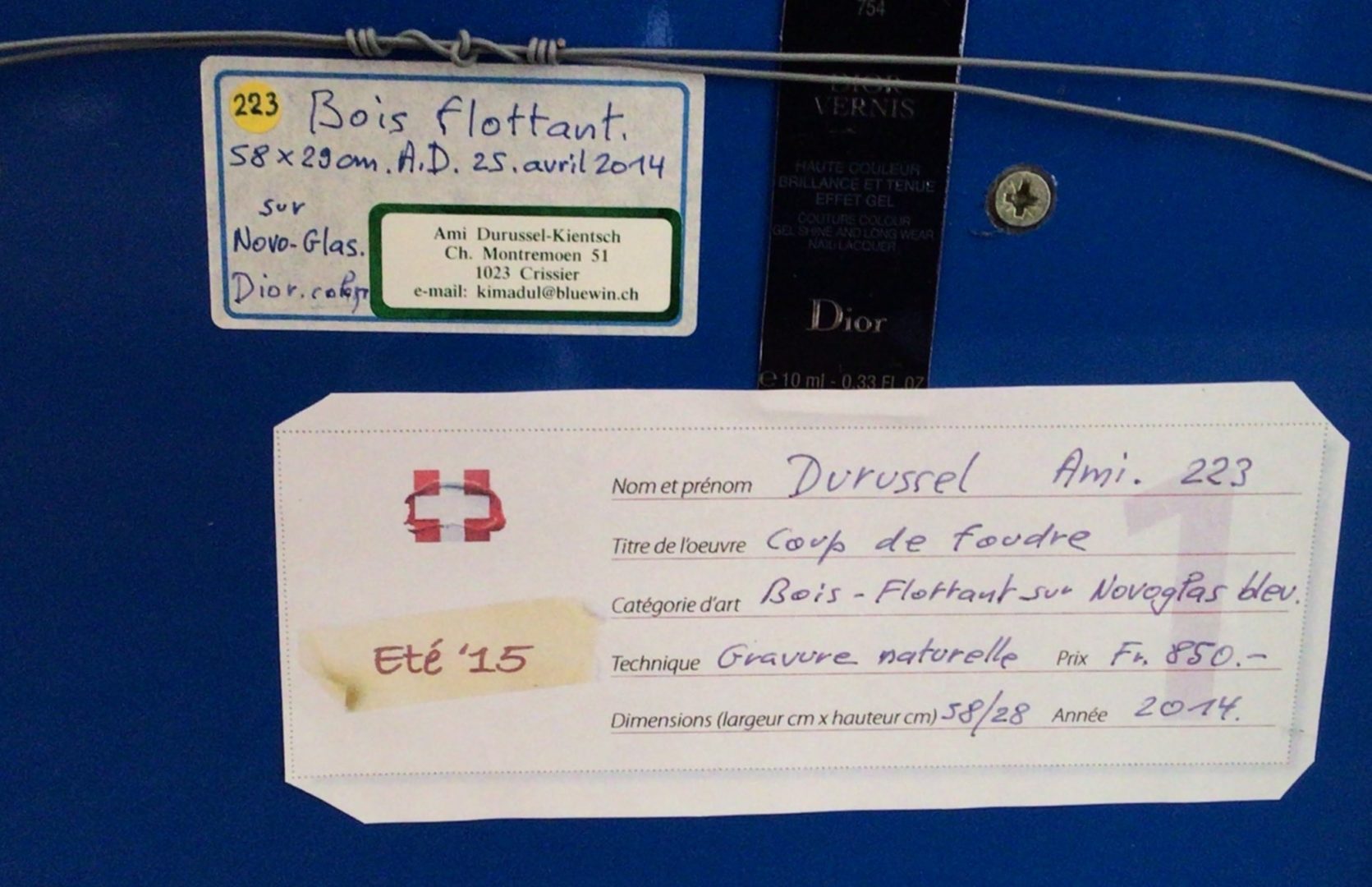 - La liste d’inventaire des oeuvres cédée par l’artiste mentionne le titre « bûche sur novoglas. Bois flottant bleu »