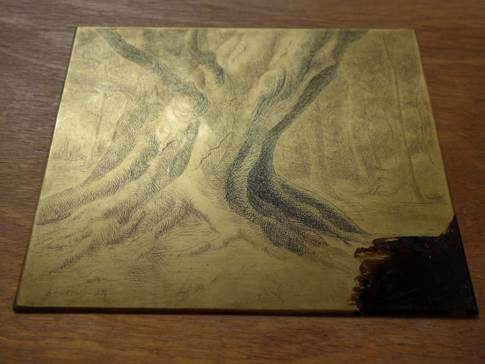 - titre "Demantou" (sic) manuscrit sur le journal d'emballage de la plaque, daté 1943 (il s'agit sans doute d'un vieux tronc d'arbre du parc Denantou à Ouchy)