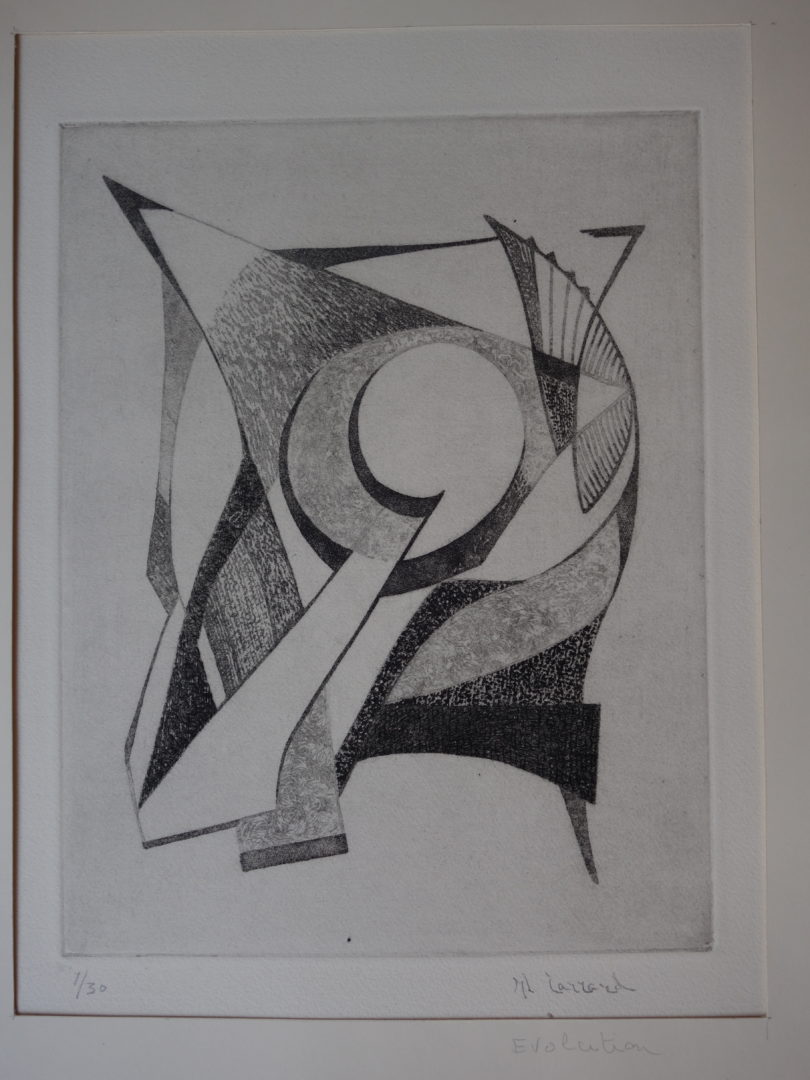 - l'étiquette collée au dos de l'épreuve 4/30, encadrée, concerne "Construction" qui était sans doute encadrée dans ce cadre avant l'oeuvre en présence. Un autre carton de fond de cadre comporte l'étiquette collée juste: "Evolution" (cf. photo). Ce dos présente aussi le n° d'ordre "209".