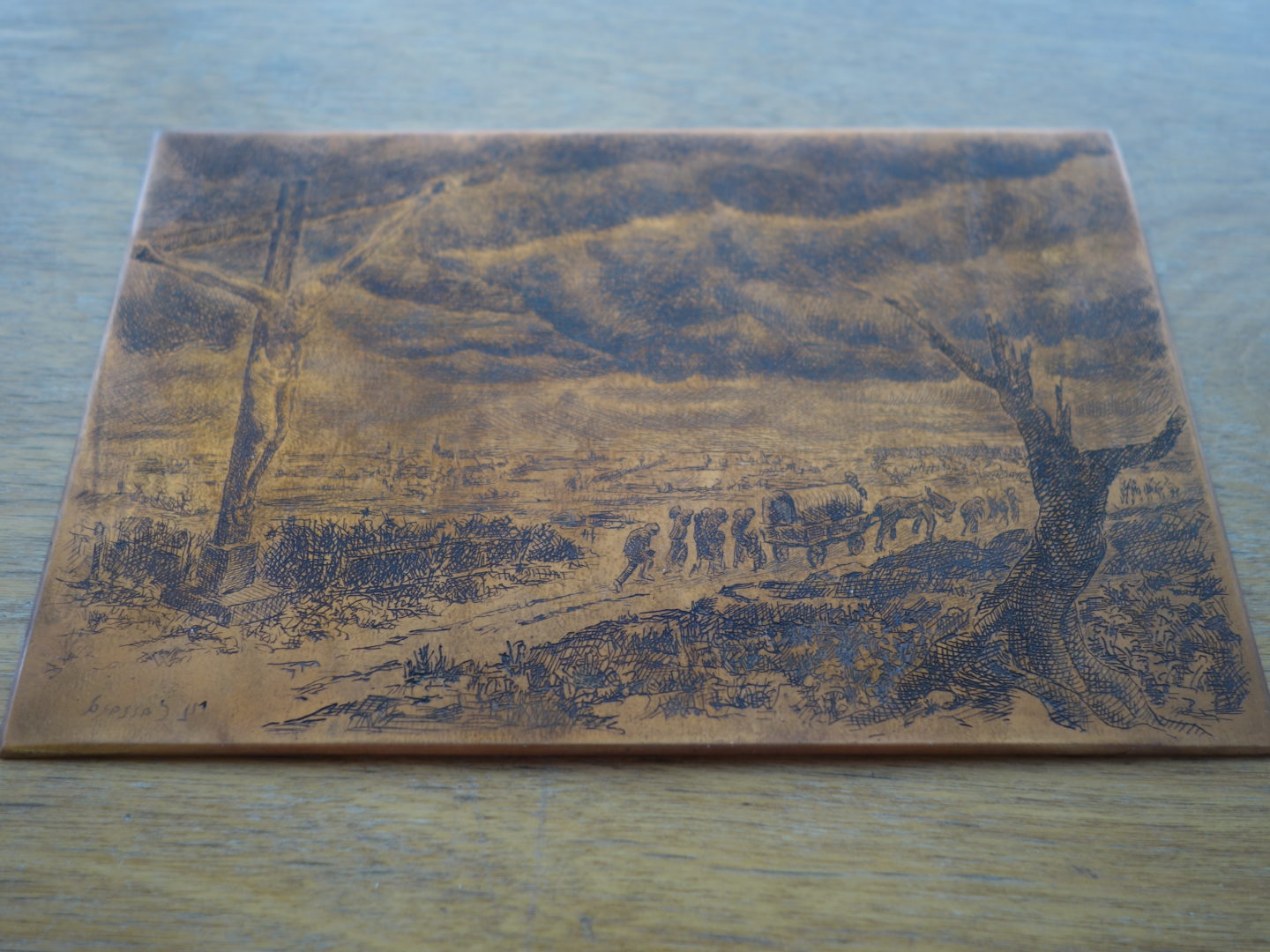 F Artiste CARRARD-KOHLER Marie-Louise Numéro d'inventaire FAA-CML-3444 Titre F Dénomination Croix de chemin et voyageurs Année 1949 Dimensions sur chassis 10.5x16 cm Technique / Support Matrice, Cuivre Catégories Scène de genre Signature / Datation "ML Carrard" bg Remarques - plaque sans épreuve - mention manuscrite illisible sur le journal d'emballage de la plaque, daté 1949 Agrandir l'image Découvrez l'artiste CARRARD-KOHLER Marie-Louise Châtelard Orbe (CH) 5 septembre 1901 / 1 décembre 1981 Fonds géré par la FAA Consulter sa fiche