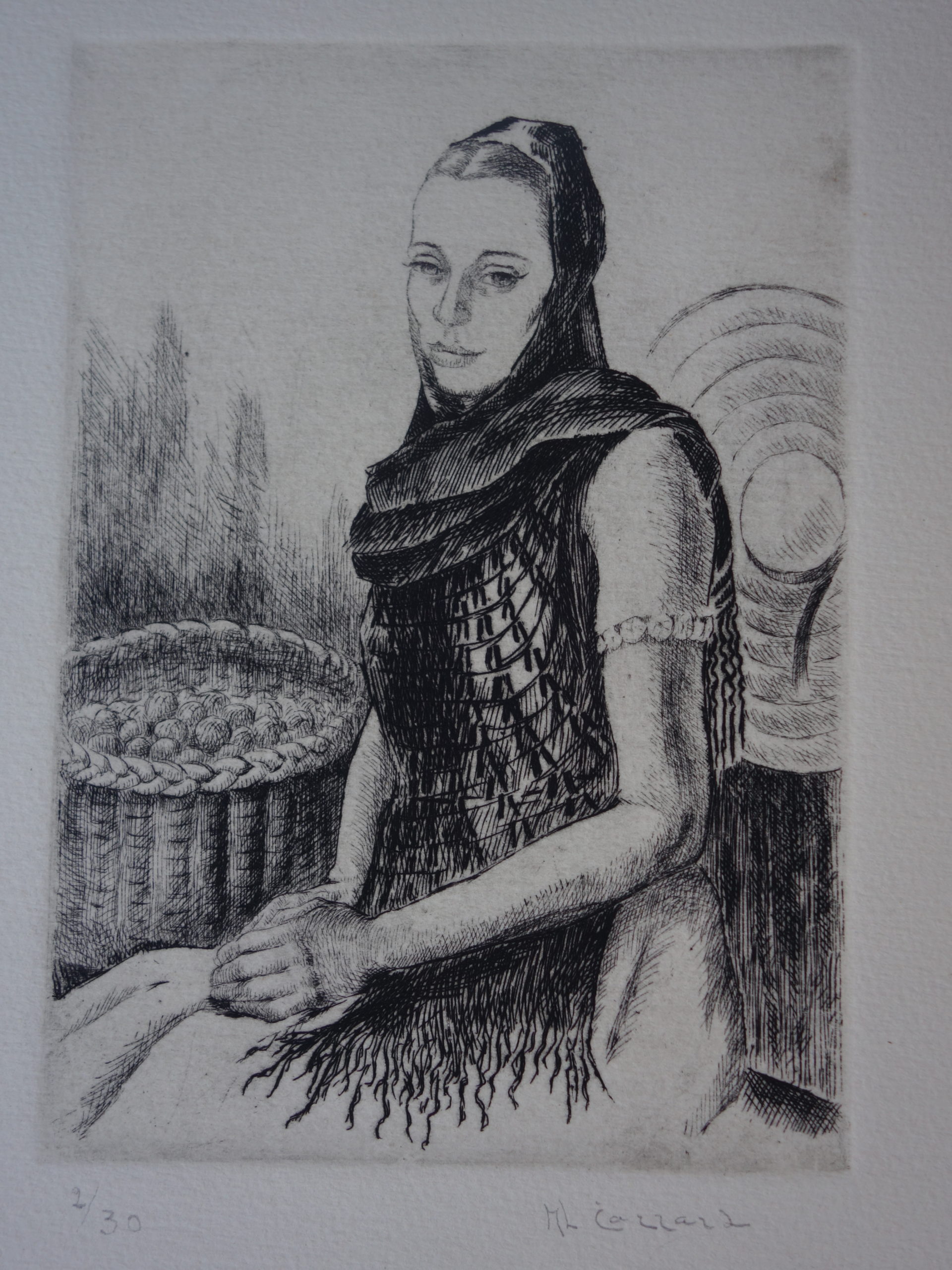 Femme au châle Artiste CARRARD-KOHLER Marie-Louise Numéro d'inventaire FAA-CML-3363 Titre Femme au châle Année 1953 Dimensions sur chassis 43.5x34.5 cm Technique / Support Eau forte Catégories Portrait Signature / Datation "ML Carrard" bd Remarques - 3 épreuve 1/30 à 3/30 - Titre manuscrit sur le journal d'emballage de la plaque, daté 1953 Agrandir l'image Découvrez l'artiste CARRARD-KOHLER Marie-Louise Châtelard Orbe (CH) 5 septembre 1901 / 1 décembre 1981 Fonds géré par la FAA Consulter sa fiche Images complémentaires CARRARD-KOHLER Marie-Louise – Femme au châle 1953 – Eau forte, 43.5x34.5 cm – Portrait