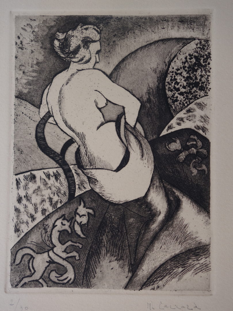 Femme Fleur Artiste CARRARD-KOHLER Marie-Louise Numéro d'inventaire FAA-CML-3373 Titre Femme Fleur Année 1951 Dimensions sur chassis 31.5x29 cm Technique / Support Eau forte, Aquatinte Catégories Figure Signature / Datation ML Carrard" bd Remarques - 1 épreuve justifiée 2/30 - Titre dans la fenêtre du passe-partout et sur le journal d'emballage de la plaque, daté 1951 Agrandir l'image Découvrez l'artiste CARRARD-KOHLER Marie-Louise Châtelard Orbe (CH) 5 septembre 1901 / 1 décembre 1981 Fonds géré par la FAA Consulter sa fiche