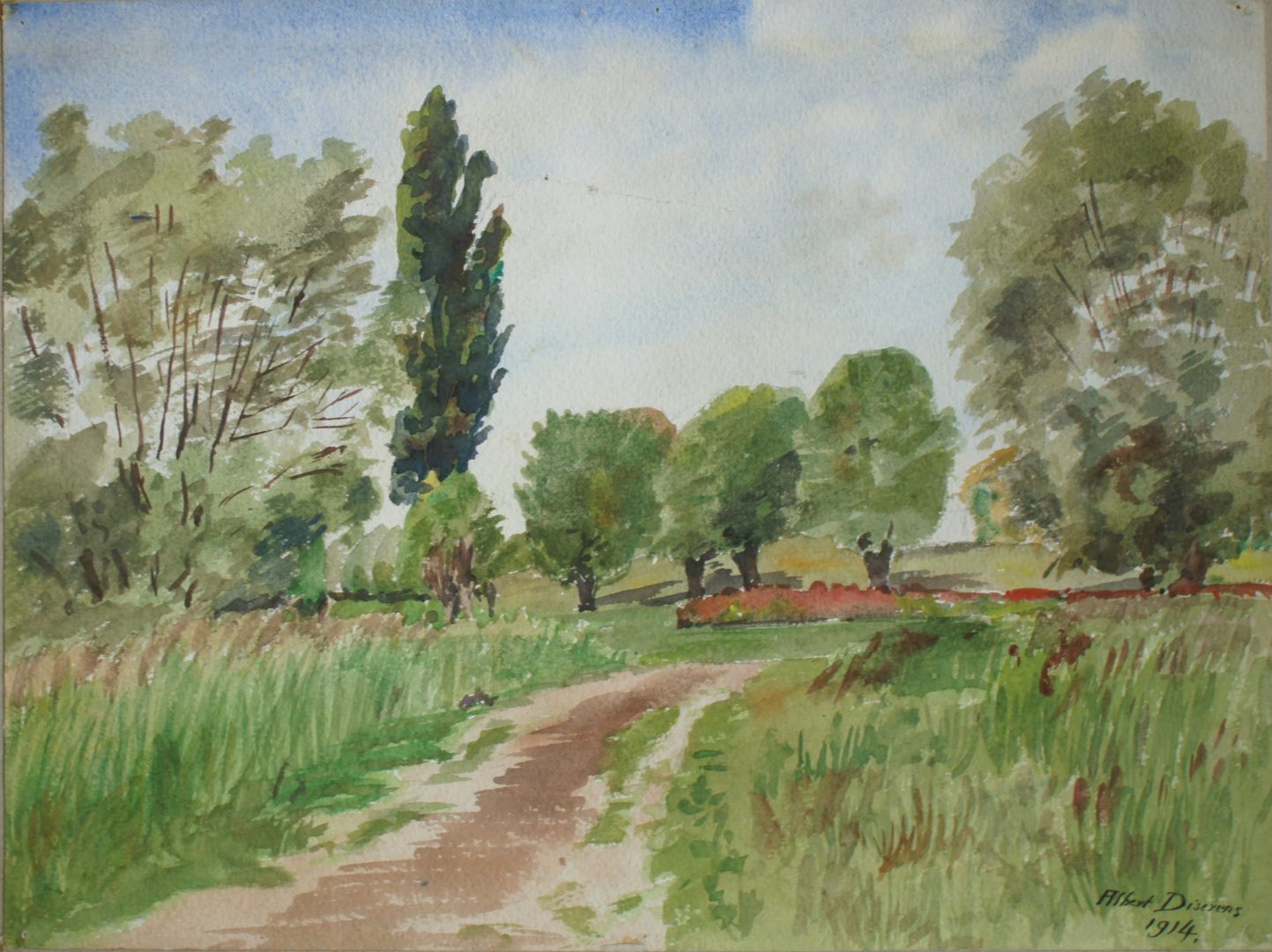 Chemin au milieu des champs et arbres Artiste DISERENS Albert Numéro d'inventaire FAA-DA-1962 Titre inconnu Dénomination Chemin au milieu des champs et arbres Année 1914 Dimensions sur chassis 27.5x37 cm Technique / Support Aquarelle Catégories Paysage Signature / Datation "Albert Diserens" / "1914" Agrandir l'image Découvrez l'artiste DISERENS Albert Lausanne (CH) 24 décembre 1891 / 9 mars 1967 Fonds géré par la FAA Consulter sa fiche