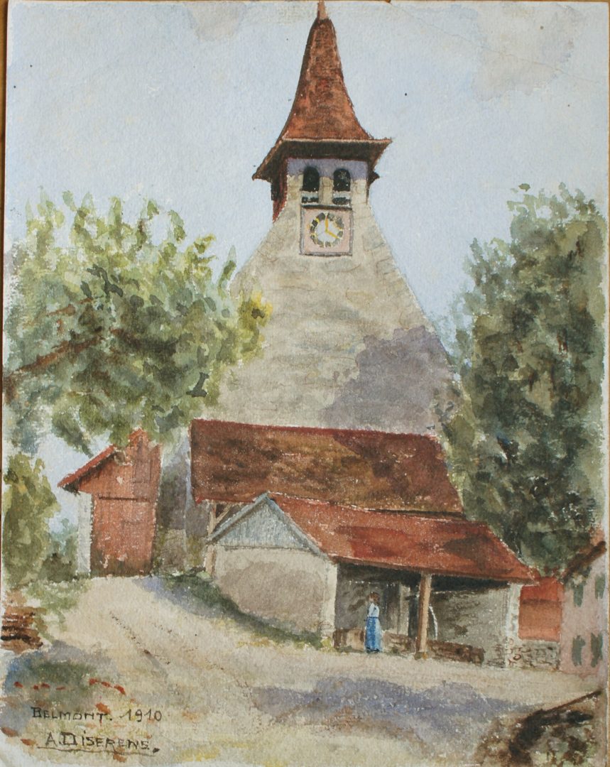 Eglise de Belmont Artiste DISERENS Albert Numéro d'inventaire FAA-DA-1978 Titre inconnu Dénomination Eglise de Belmont Année 1910 Dimensions sur chassis 29x22.5 cm Technique / Support Aquarelle Catégories Paysage Signature / Datation "BELMONT 1910" / "A. DISERENS" bg Remarques - coin supérieur droit déchiré et scotché Agrandir l'image Découvrez l'artiste DISERENS Albert Lausanne (CH) 24 décembre 1891 / 9 mars 1967 Fonds géré par la FAA Consulter sa fiche