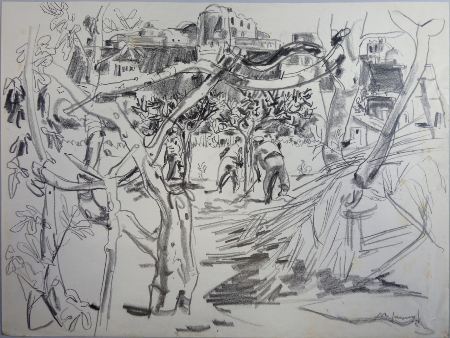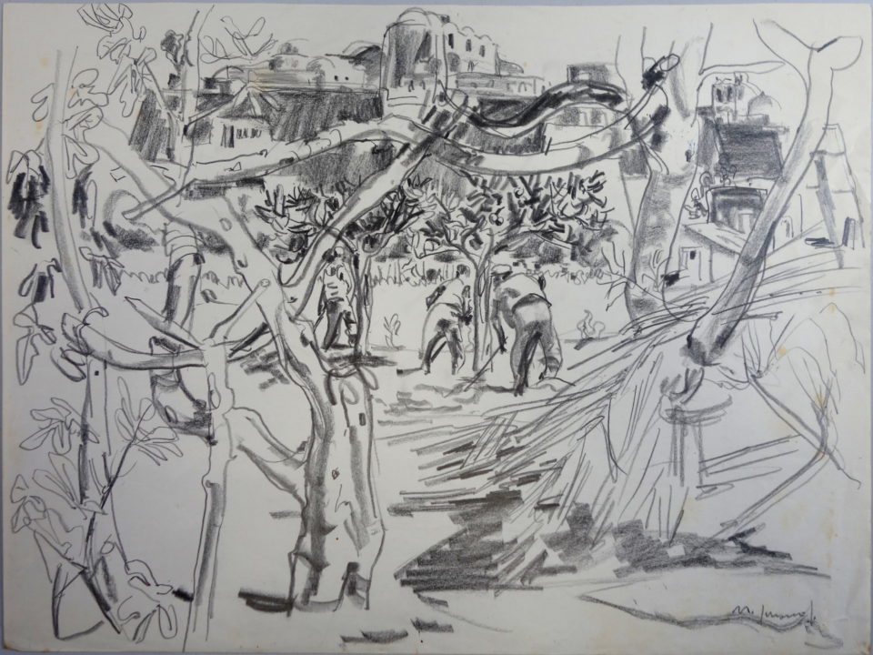 Trois paysans travaillant dans un verger Artiste GENOUD Nanette Numéro d'inventaire FAA-GN-2631 Titre inconnu Dénomination Trois paysans travaillant dans un verger Dimensions sur chassis 29x42 cm Technique / Support Crayon Catégories Paysage Signature / Datation "n.Genoud."BD Remarques Les paysans sont vus à travers des arbres au premier plan. Agrandir l'image Découvrez l'artiste GENOUD Nanette (CH) 9 avril 1907 / 30 novembre 1987 Fonds géré par la FAA Consulter sa fiche