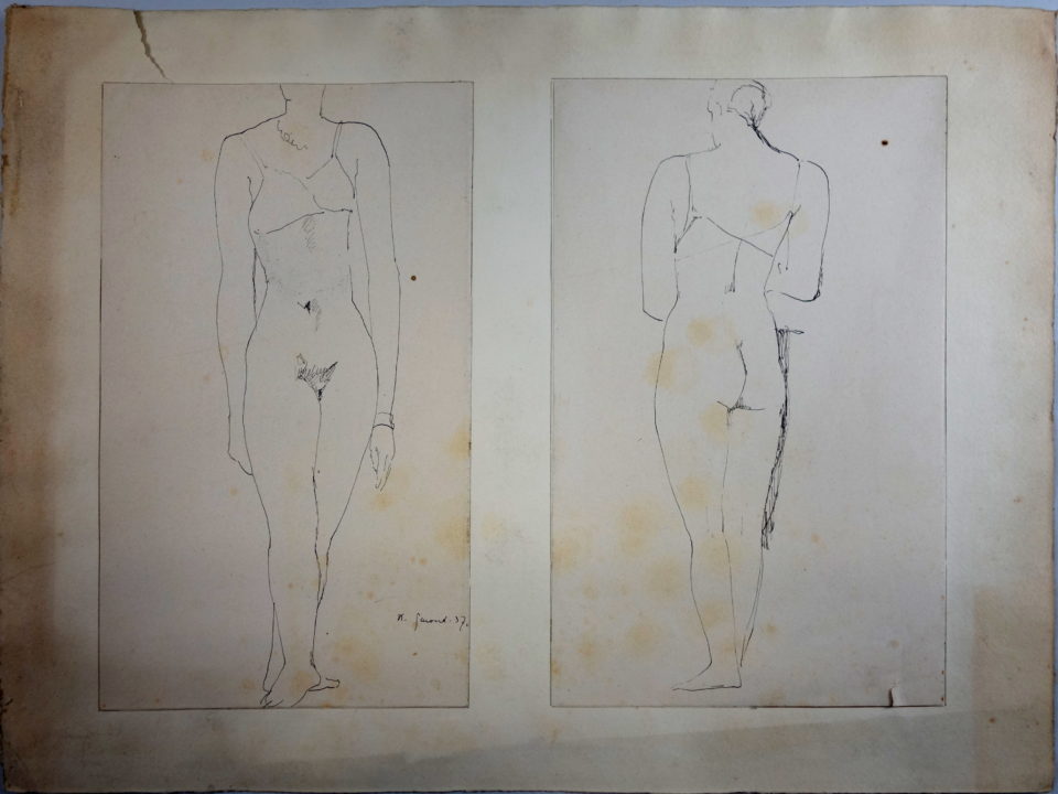 Personnage dénudé vu de face et de dos Artiste GENOUD Nanette Numéro d'inventaire FAA-GN-2634 Titre inconnu Dénomination Personnage dénudé vu de face et de dos Année 1937 Dimensions sur chassis 30.5x19 cm Technique / Support Encre Catégories Figure Signature / Datation "n.Genoud.37" Sur dessin de gauche bd Remarques Dessin à la plume Agrandir l'image Découvrez l'artiste GENOUD Nanette (CH) 9 avril 1907 / 30 novembre 1987 Fonds géré par la FAA Consulter sa fiche