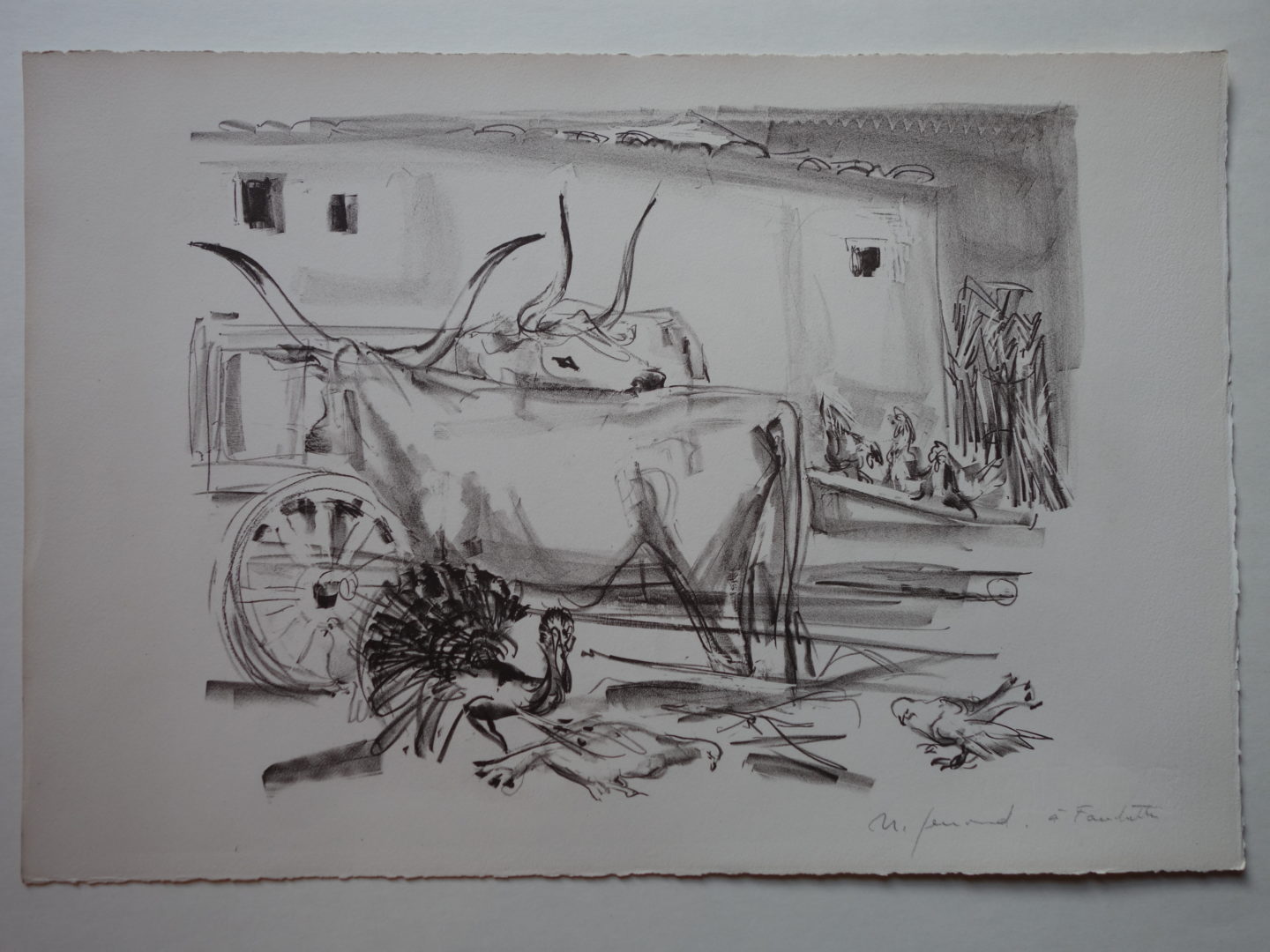 Boeufs, paon et pigeons dans une cour Artiste GENOUD Nanette Numéro d'inventaire FAA-GN-2703 Titre inconnu Dénomination Boeufs, paon et pigeons dans une cour Dimensions sur chassis 28x41 cm Technique / Support Lithographie Catégories Animaux Signature / Datation "n. Genoud" Remarques 1 épreuve noire signée bd et avec la mention "à Fanchette" bd 3 épreuves noires signées bg ou bd 3 épreuves noires non signées Agrandir l'image Découvrez l'artiste GENOUD Nanette (CH) 9 avril 1907 / 30 novembre 1987 Fonds géré par la FAA Consulter sa fiche