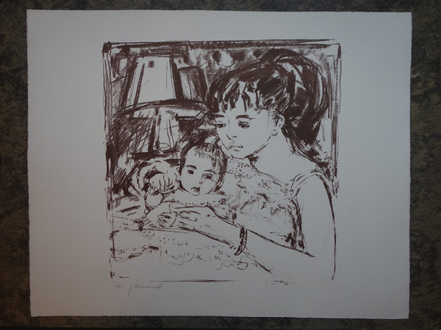 1 épreuve signée, fortement tachée, de format plus petit, avec la mention "Une Promesse / bBientôt tenue Grâce à Dieu,/ A Fernand et Fernande Roulin mes Compère et commère"