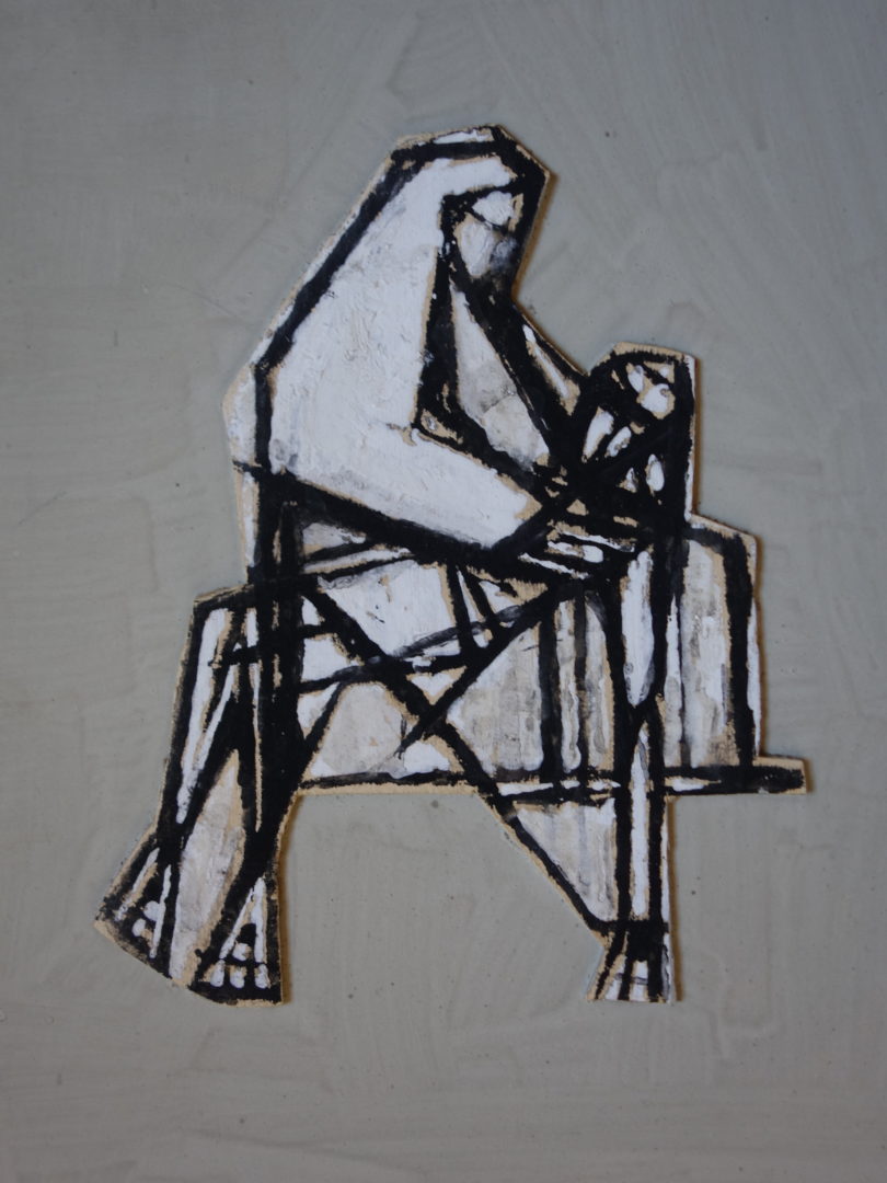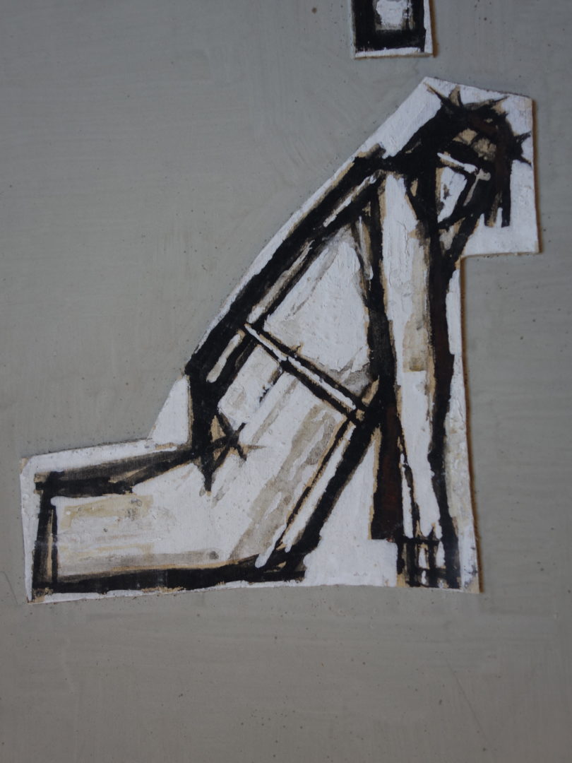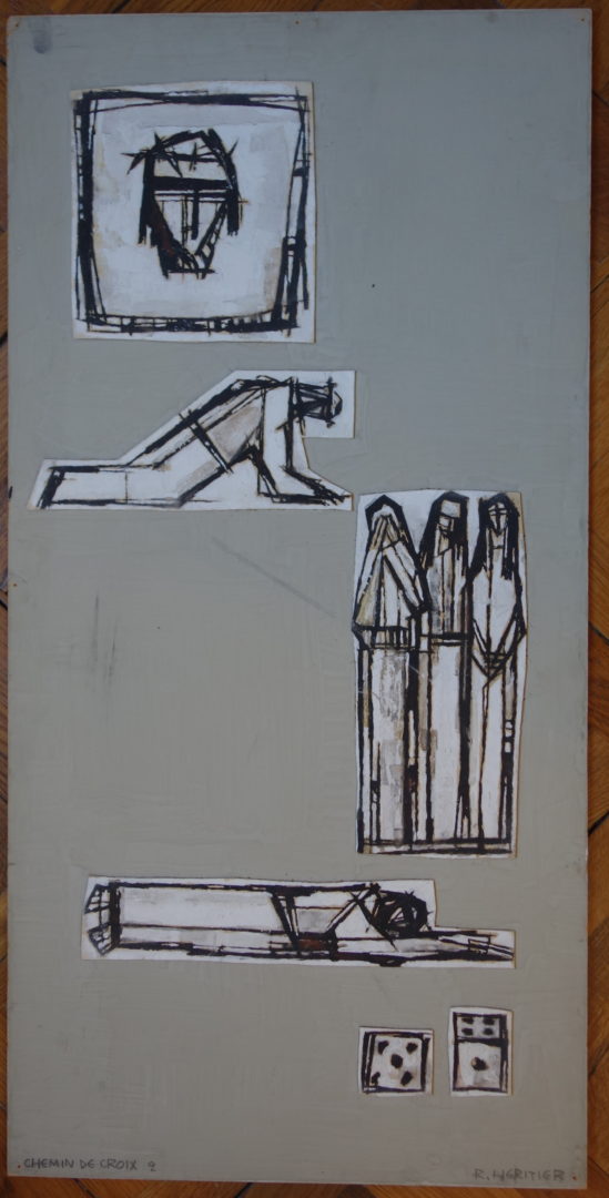 3 panneaux en bois aggloméré (pavatex) présentant de manière stylisée les 14 stations du Chemin de croix