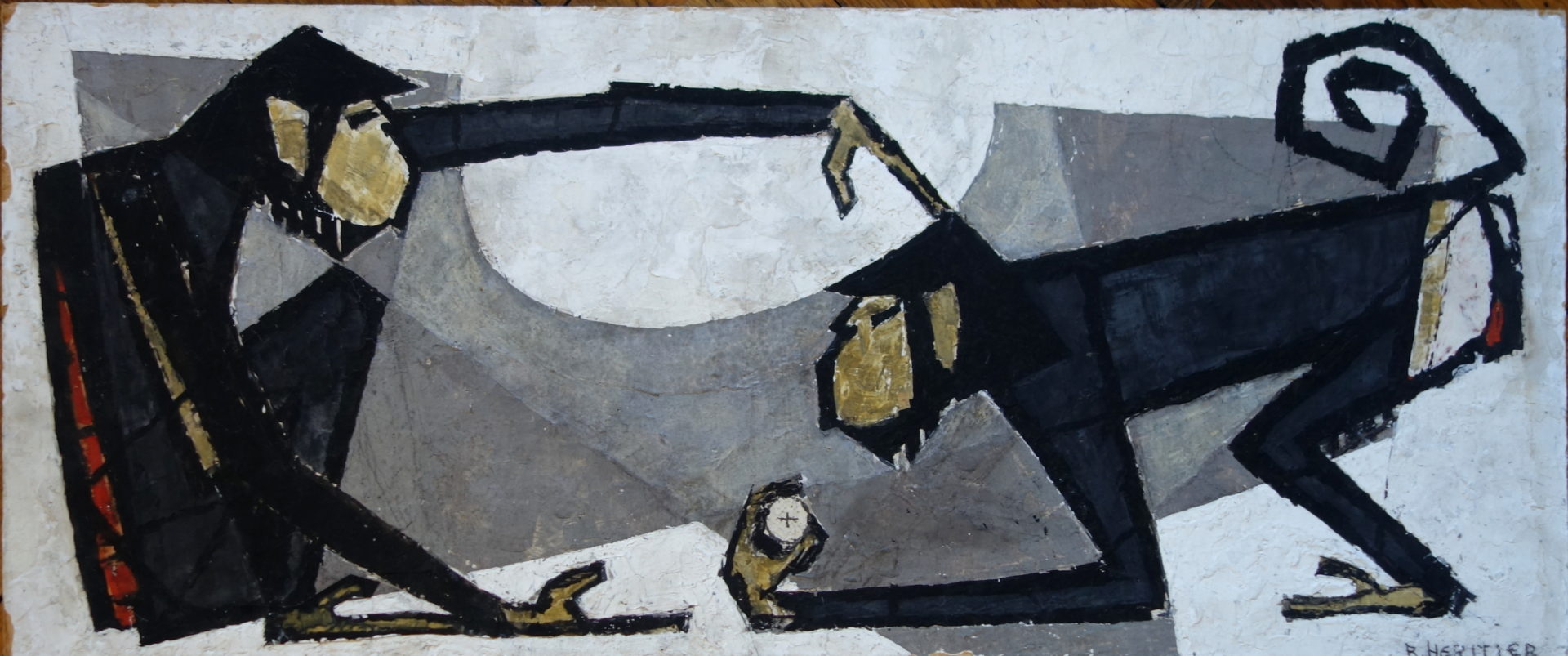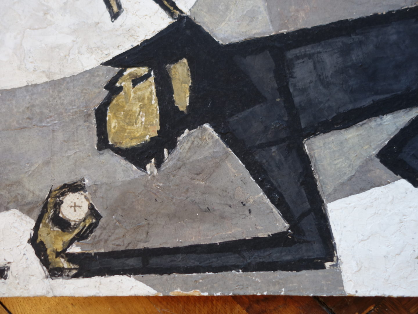Projet sur bois aggloméré (pavatex) comportant le texte suivant sur une étiquette collée au dos: "Mosaïque réalisée pour une / fontaine située sur le haut / de Lutry. / La main du singe de droite / tient le goulot. / Le surnom des habitants de Lutry / est le singe."