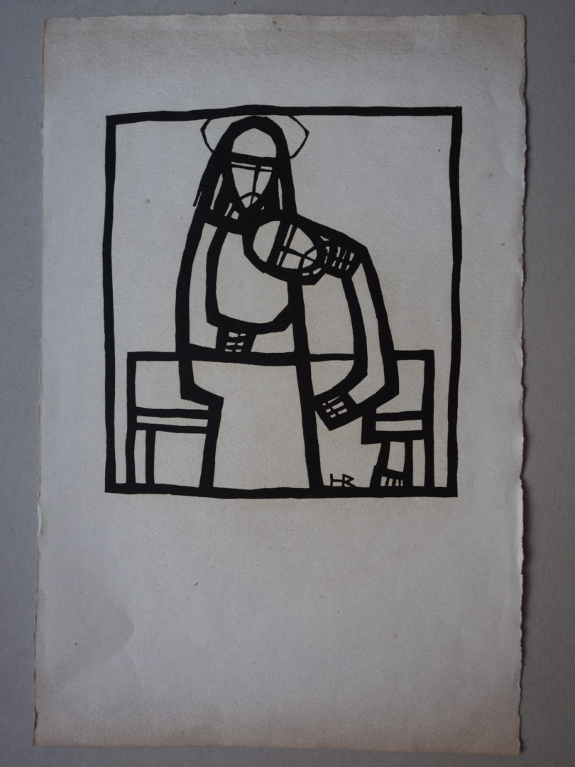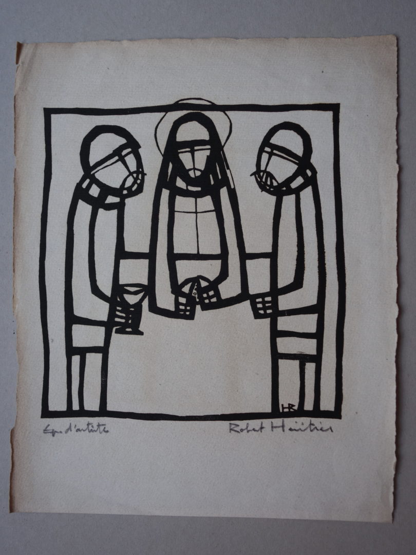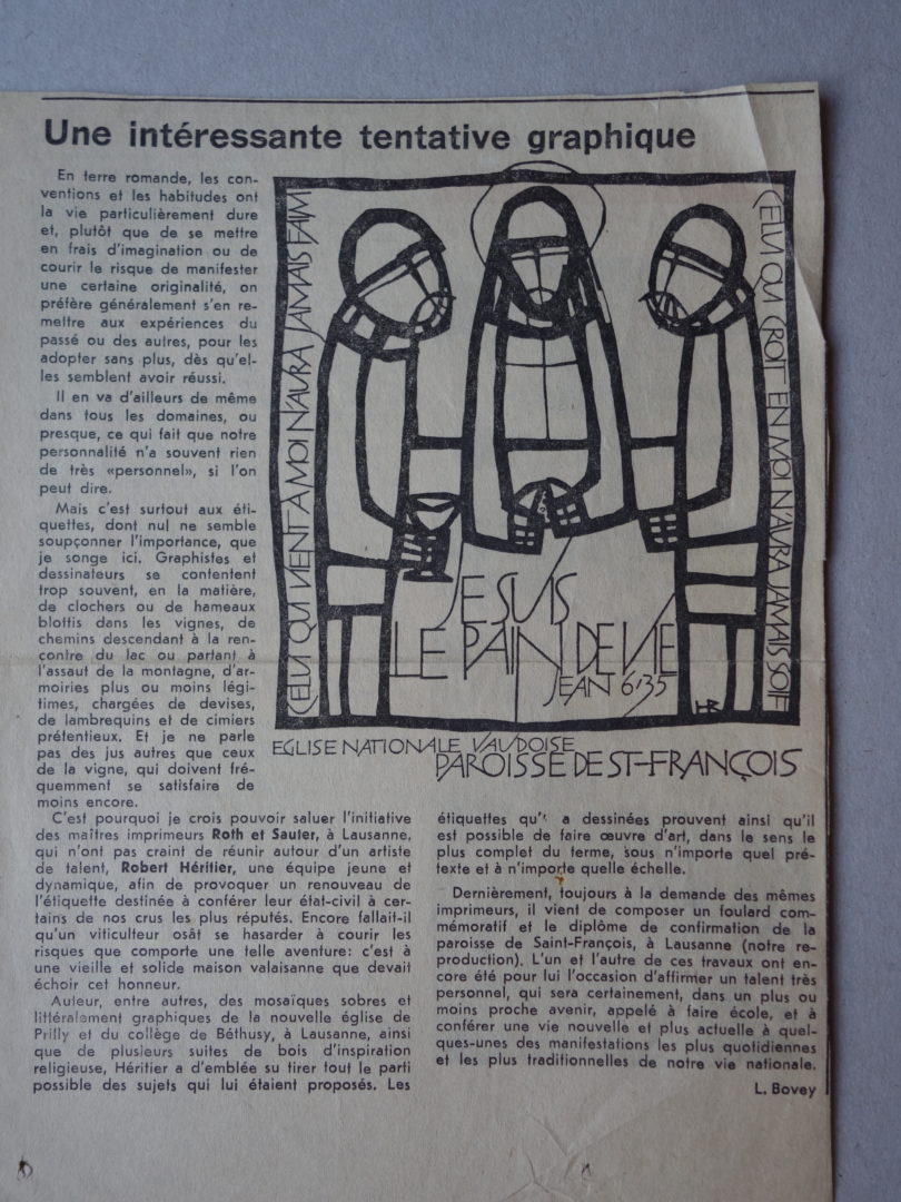 1 épreuve: Jésus rompant le pains avec les pèlerins d'Emmaüs, signée et justifiée "Epr. d'artiste". Ce sujet était destiné à un foulard commémoratif et un Diplôme de confirmation de la paroisse de St-François à Lausanne (cf. article de journal joint)