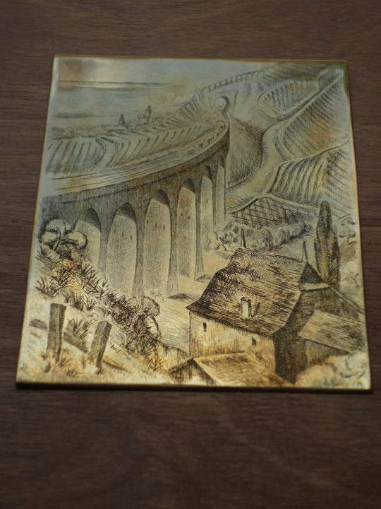 Pont de chemin de fer dans le Lavaux Artiste CARRARD-KOHLER Marie-Louise Numéro d'inventaire FAA-CML-3442 Titre inconnu Dénomination Pont de chemin de fer dans le Lavaux Année 1950 Dimensions sur chassis 18x14 cm Technique / Support Laiton, Matrice Catégories Paysage Remarques - plaque sans épreuve - mention manuscrite "Pont" sur le journal d'emballage de la plaque, daté 1950 Agrandir l'image Découvrez l'artiste CARRARD-KOHLER Marie-Louise Châtelard Orbe (CH) 5 septembre 1901 / 1 décembre 1981 Fonds géré par la FAA Consulter sa fiche