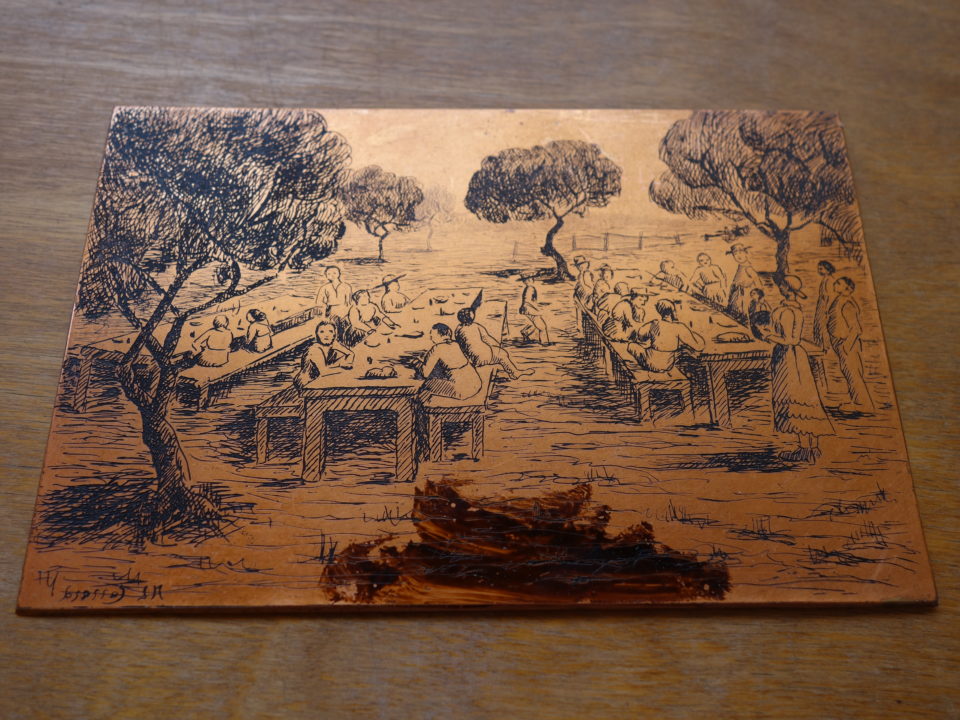 Repas collectif dans un verger Artiste CARRARD-KOHLER Marie-Louise Numéro d'inventaire FAA-CML-3458 Titre inconnu Dénomination Repas collectif dans un verger Dimensions sur chassis 9.5x14 cm Technique / Support Cuivre, Matrice Catégories Scène de genre Signature / Datation "ML Carrard" bg Remarques - plaque sans épreuve Agrandir l'image Découvrez l'artiste CARRARD-KOHLER Marie-Louise Châtelard Orbe (CH) 5 septembre 1901 / 1 décembre 1981 Fonds géré par la FAA Consulter sa fiche