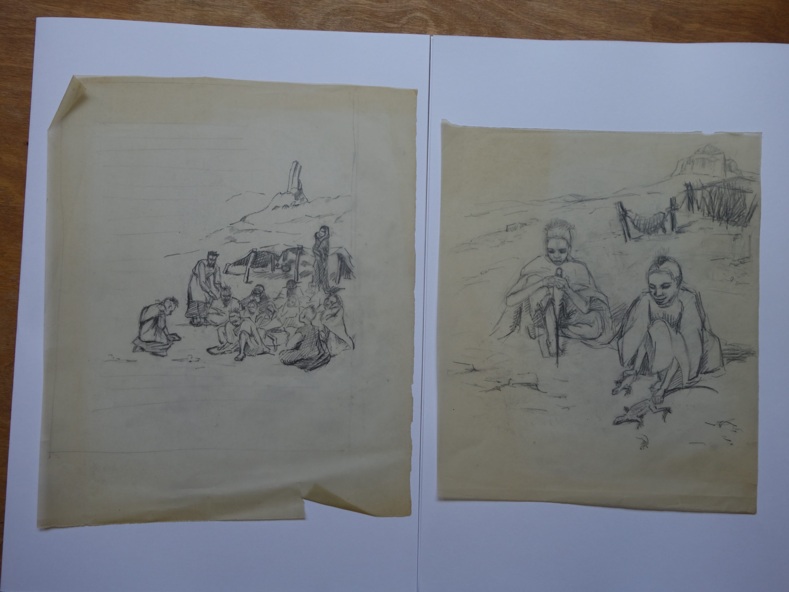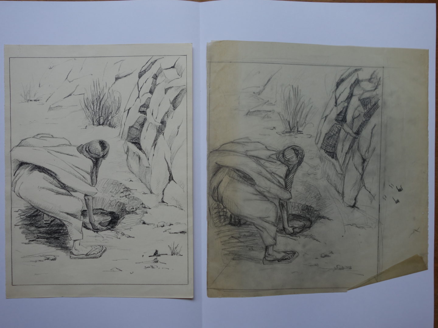 Bédouin puisant de l'eau dans une source Artiste CARRARD-KOHLER Marie-Louise Numéro d'inventaire FAA-CML-3475 Titre inconnu Dénomination Bédouin puisant de l'eau dans une source Dimensions sur chassis 31x23.5 cm Technique / Support Lithographie Catégories Scène de genre Remarques - 1 épreuve litho - 1 dessin préparatoire sur papier calque se rapportant au sujet - 2 dessins de campement de bédouins sur papier calque Agrandir l'image Découvrez l'artiste CARRARD-KOHLER Marie-Louise Châtelard Orbe (CH) 5 septembre 1901 / 1 décembre 1981 Fonds géré par la FAA Consulter sa fiche Images complémentaires CARRARD-KOHLER Marie-Louise – Bédouin puisant de l'eau dans une source – Lithographie, 31x23.5 cm – Scène de genre