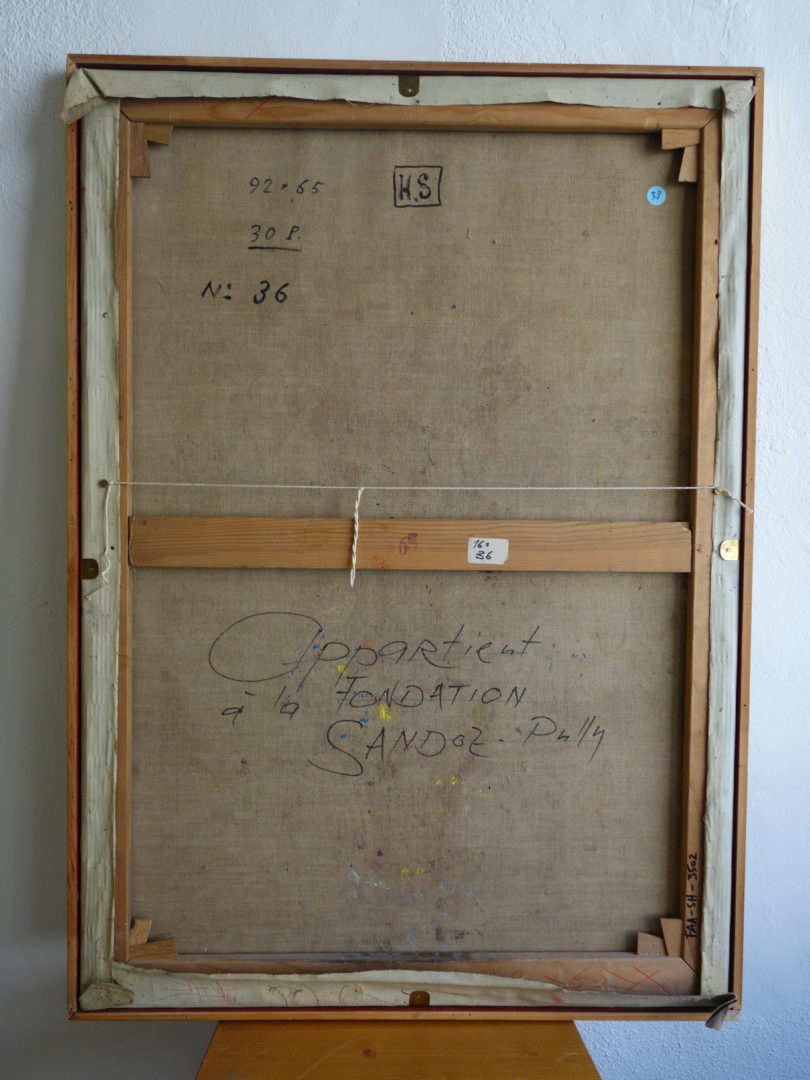 - "Appartient / à la Fondation / Sandoz-Pully" inscription de la veuve au dos du tableau. Ce tableau a été racheté par Jean Menthonnex dans un antiquariat par la suite et donné à la FAA en 2019