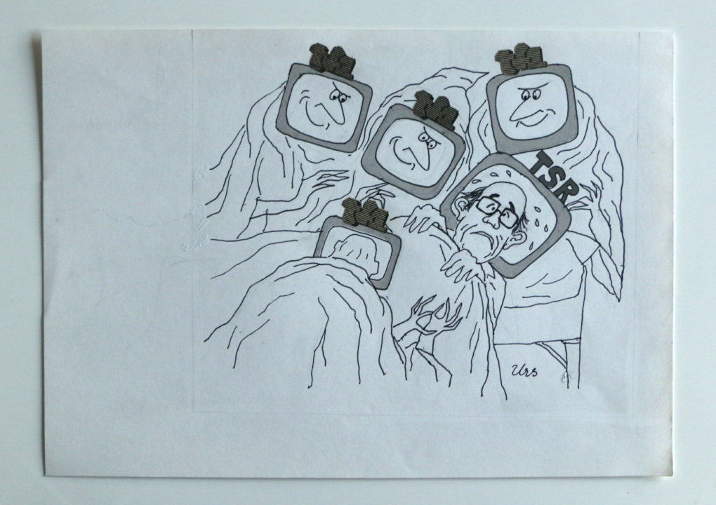 La TSR et Guillaume Chenevière menacés par TF1 Artiste URS (Frédéric Studer) Numéro d'inventaire FAA-URS-4105 Titre inconnu Dénomination La TSR et Guillaume Chenevière menacés par TF1 Technique / Support Encre, Trame, Papier Catégories Scène de genre Signature / Datation "Urs" bd Remarques - mention "TV Hebdo" au dos Agrandir l'image Découvrez l'artiste URS (Frédéric Studer) (CH) 26 mai 1926 / 22 octobre 2005 Fonds géré par la FAA Consulter sa fiche