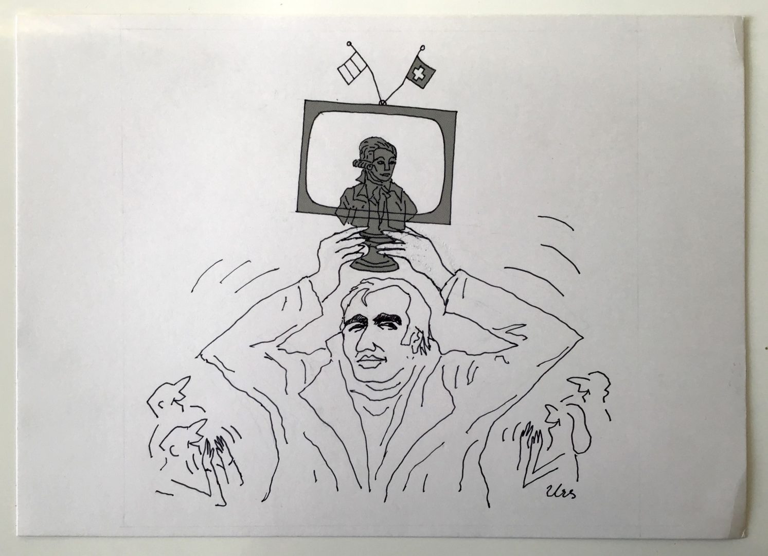 Télévision-trophée Artiste URS (Frédéric Studer) Numéro d'inventaire FAA-URS-4176 Titre inconnu Dénomination Télévision-trophée Technique / Support Encre, Trame, Papier Catégories Scène de genre Signature / Datation « Urs » bd Remarques - inscription au dos « TV hebdo » Agrandir l'image Découvrez l'artiste URS (Frédéric Studer) (CH) 26 mai 1926 / 22 octobre 2005 Fonds géré par la FAA Consulter sa fiche