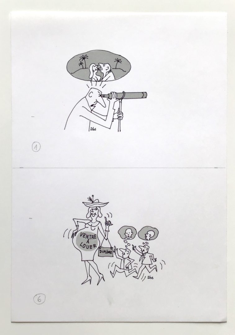Deux dessins Artiste URS (Frédéric Studer) Numéro d'inventaire FAA-URS-4400 Titre inconnu Dénomination Deux dessins Technique / Support Encre, Trame, Papier Catégories Scène de genre Signature / Datation « Urs » bm (dessin du haut), bd (dessin de bd) Remarques - dessin du haut, no 1, Voyeur - dessin du bas, no 6, « Ventre à louer » Agrandir l'image Découvrez l'artiste URS (Frédéric Studer) (CH) 26 mai 1926 / 22 octobre 2005 Fonds géré par la FAA Consulter sa fiche