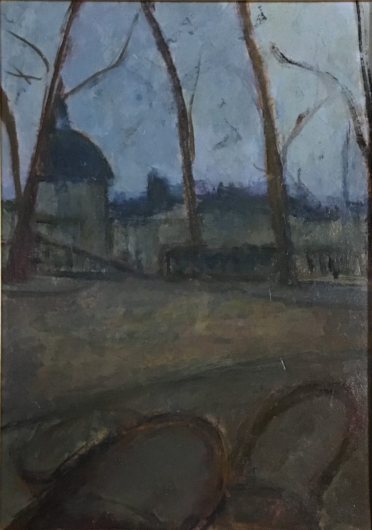 - Dans la documentation FAA de cette artiste, se trouve la photo d’un tableau qui correspond sans doute à l’oeuvre avec le titre « la coupole » dans la liste de l’exposition à la galerie Ballens, 1984.
