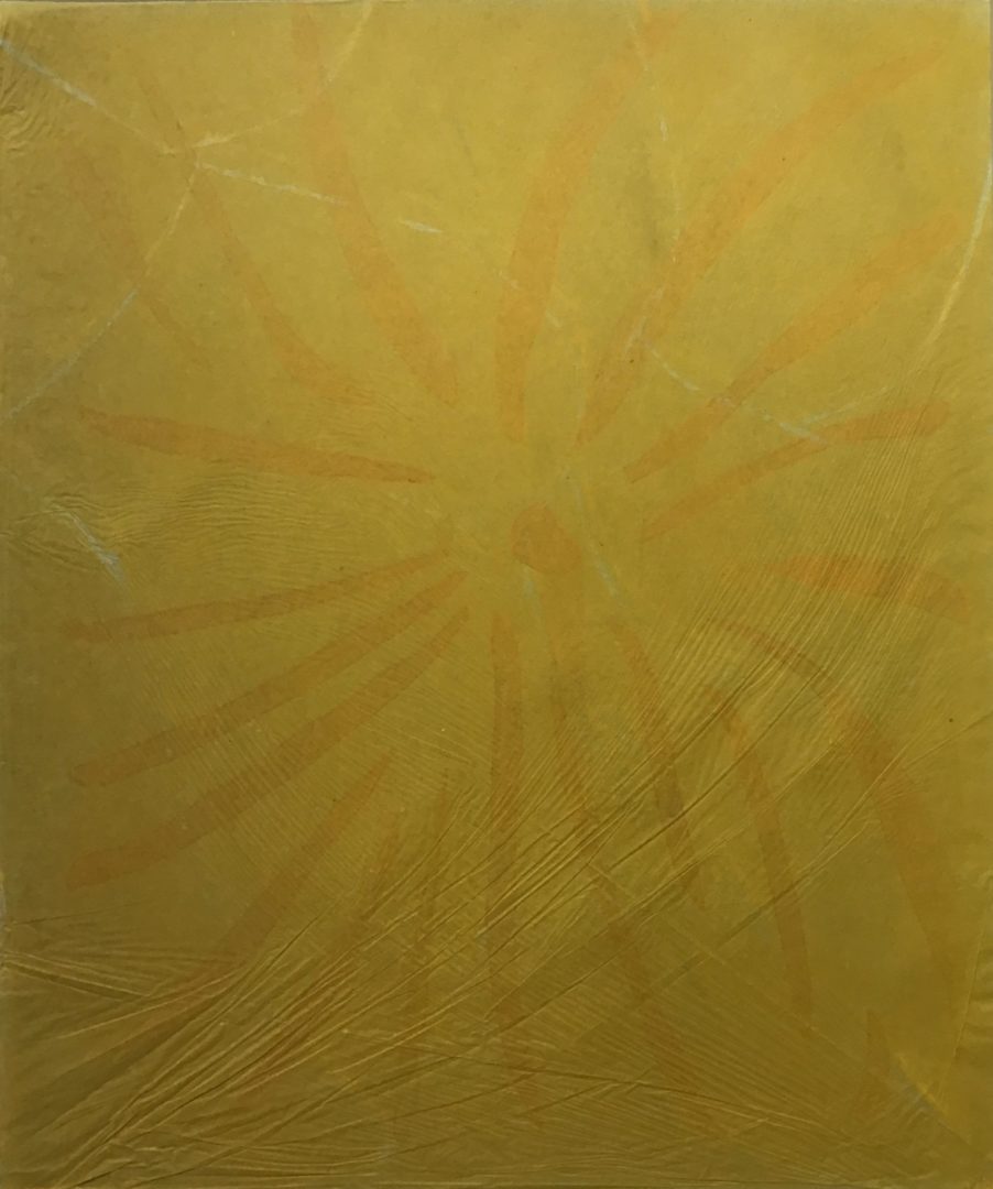 - L’effet final de l’oeuvre est produit par la superposition de deux actions aux pochoirs sur le papier de fond sur lequel est posé une feuille de pergamine réalisée au pochoir.