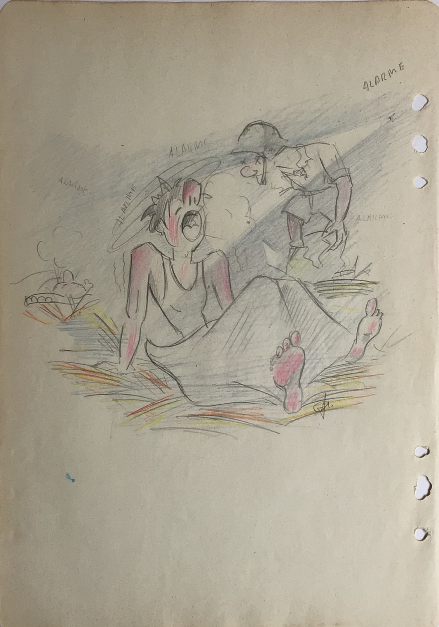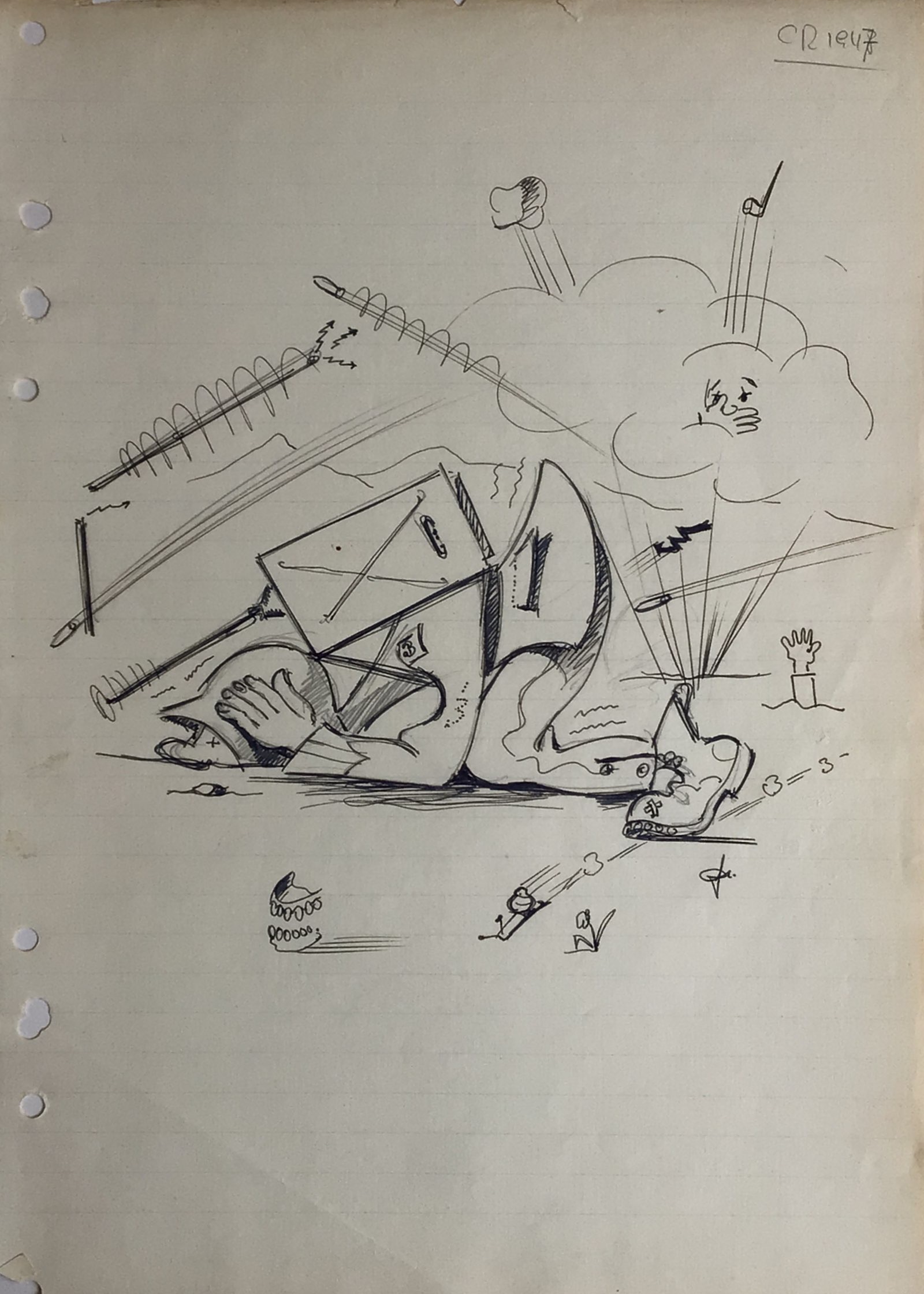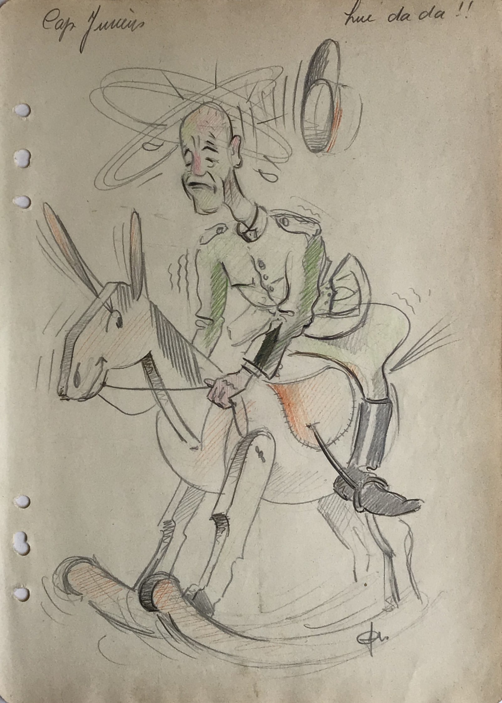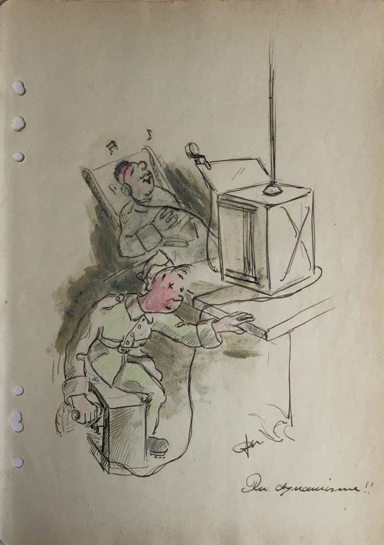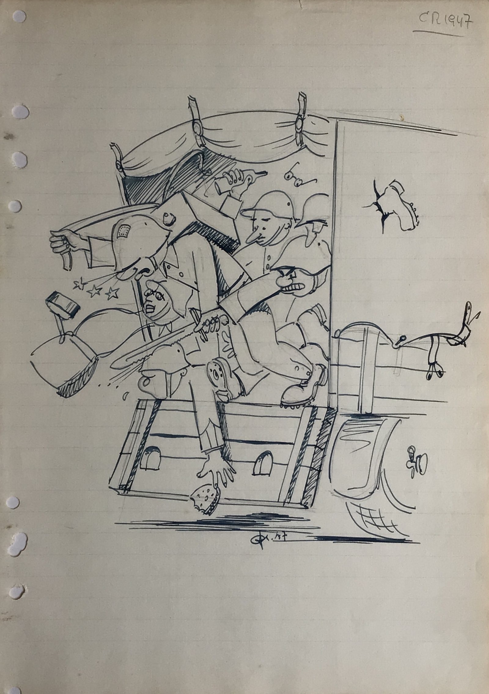 - Feuillet de divers dessins datant de 1945 à 1947 caricaturant la guerre.