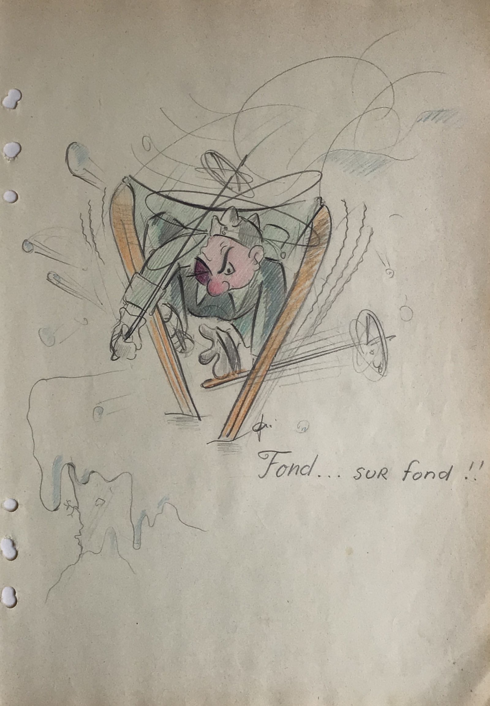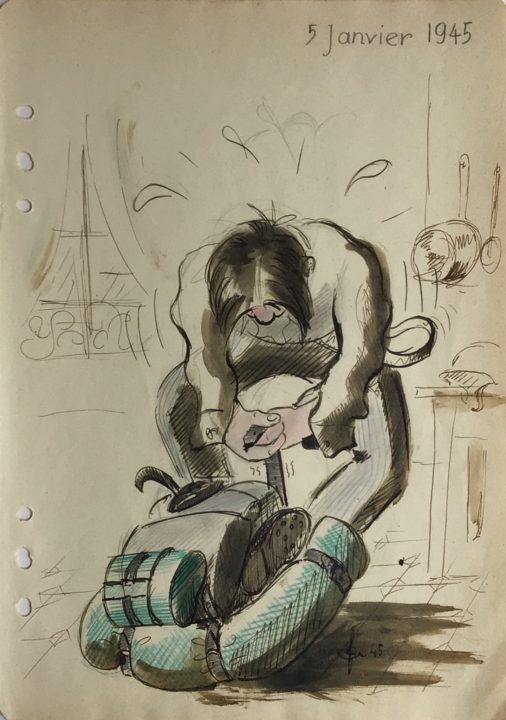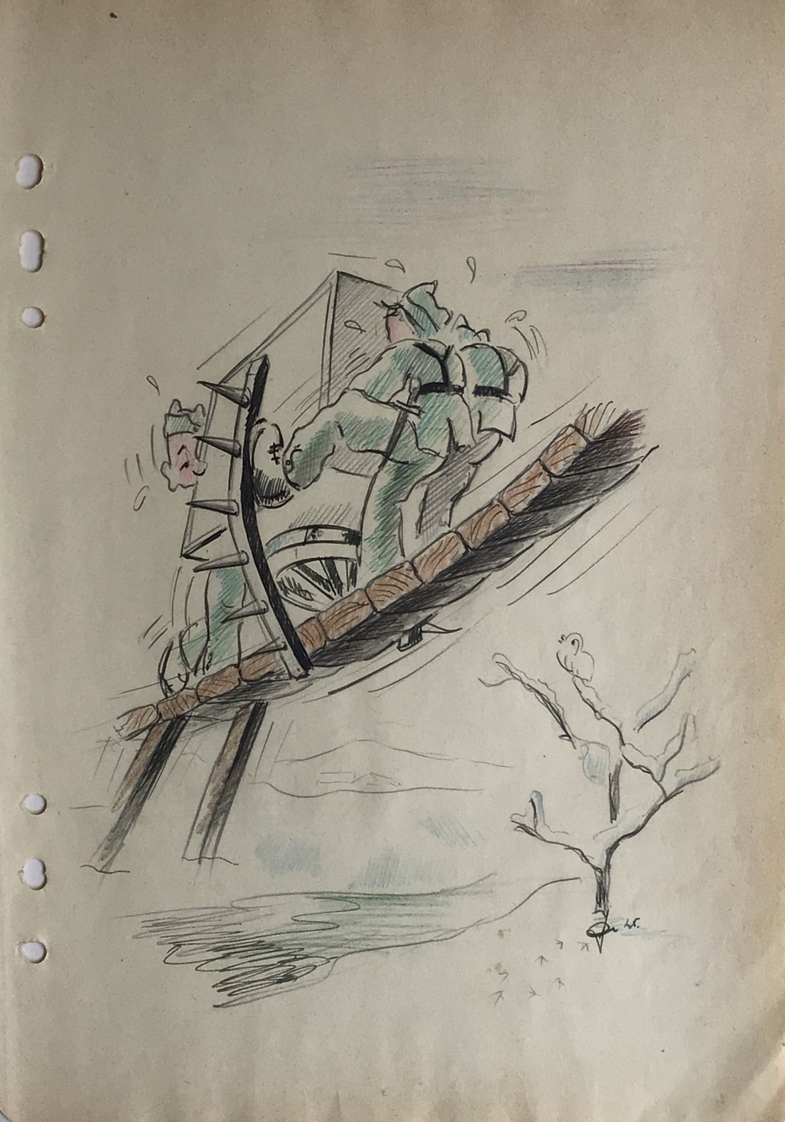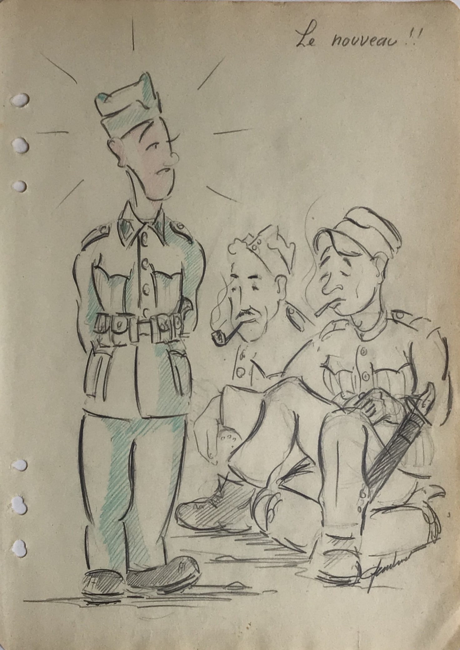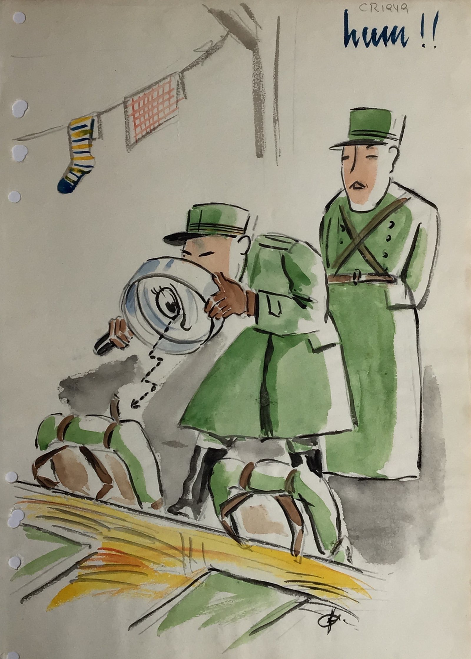 - Feuillet de divers dessins datant de 1945 à 1947 caricaturant la guerre.