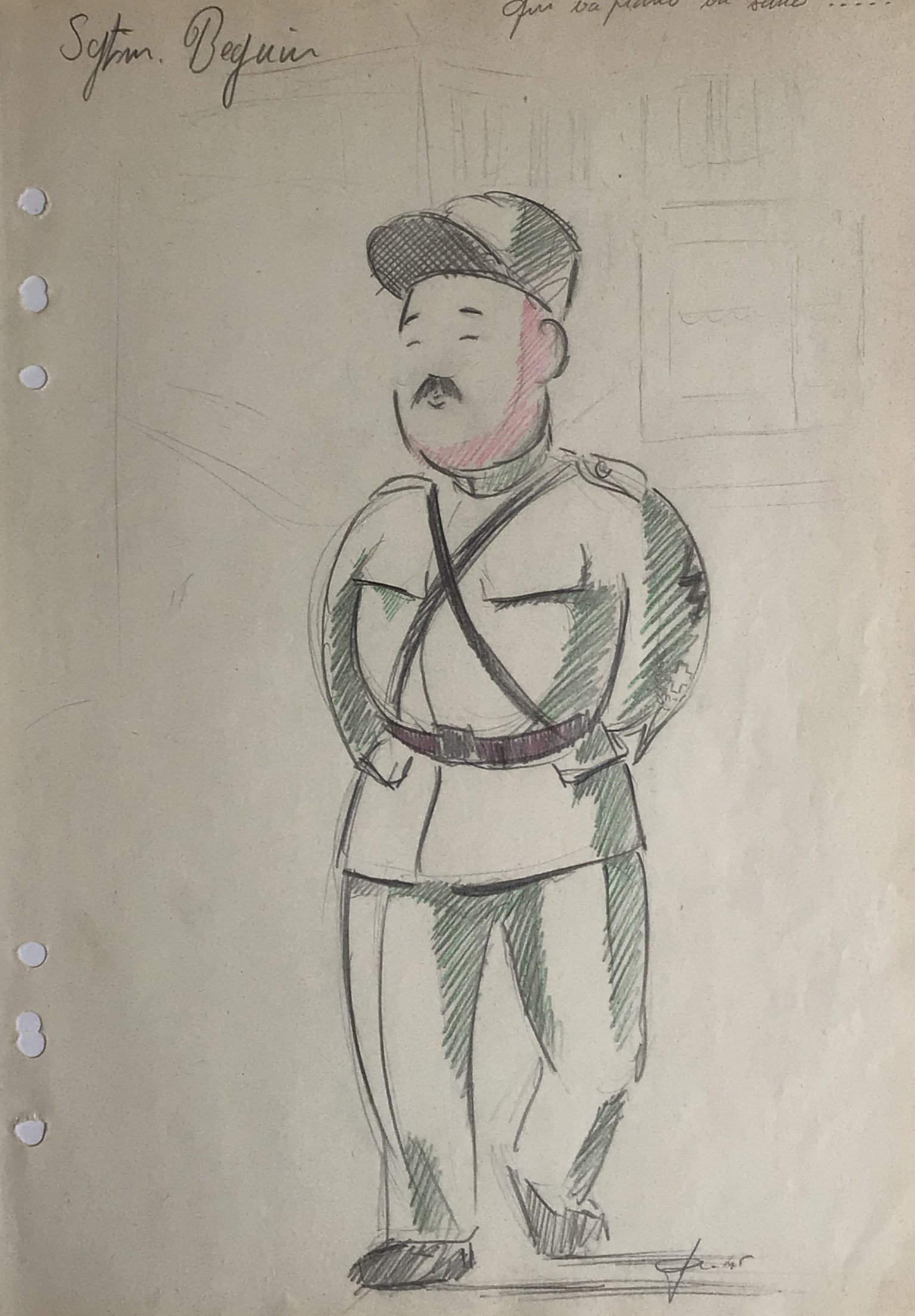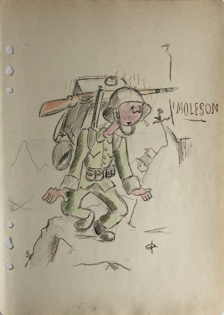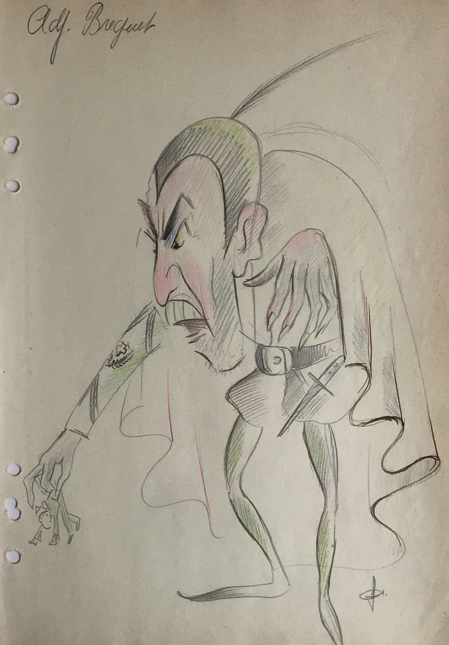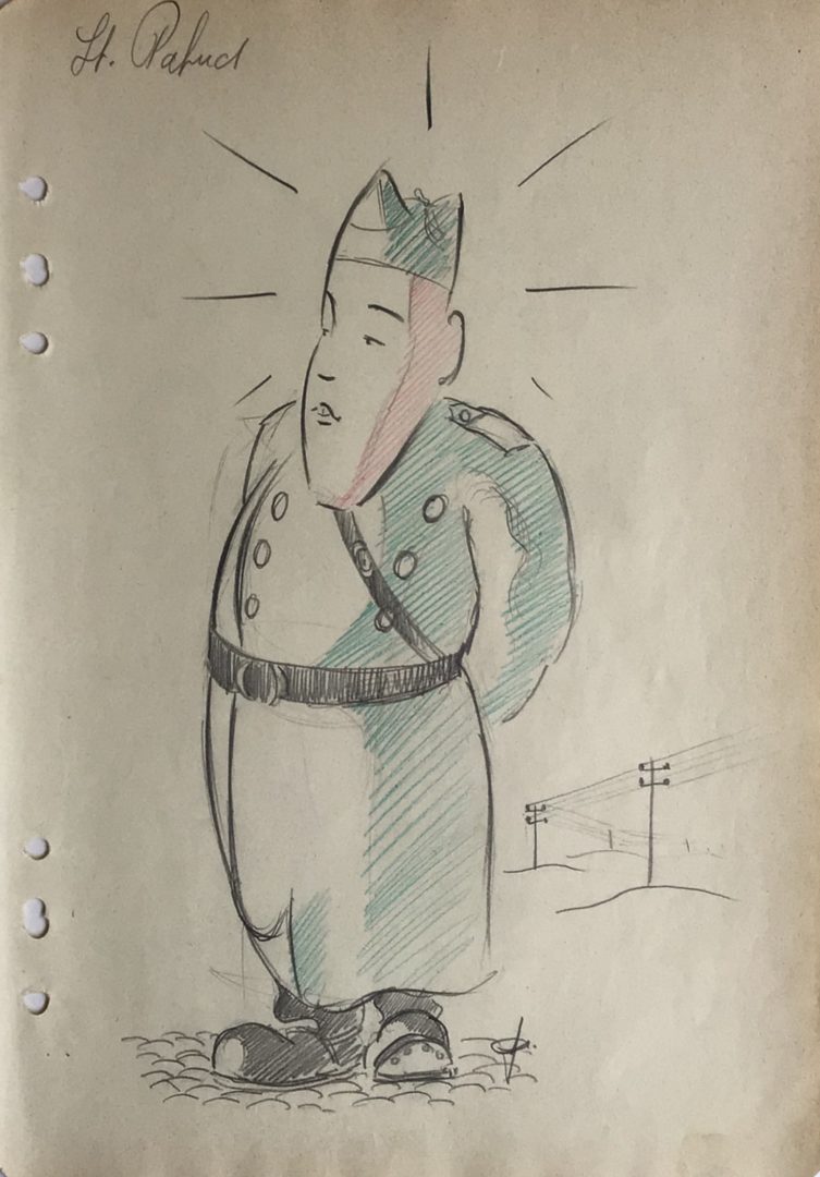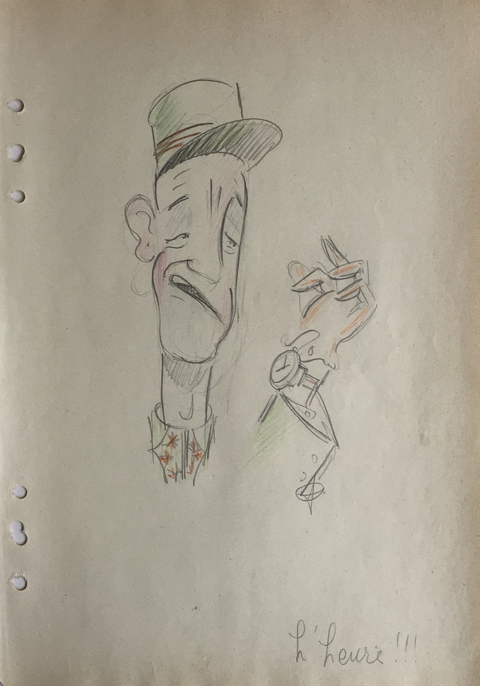 - Feuillet de divers dessins datant de 1945 à 1947 caricaturant la guerre.