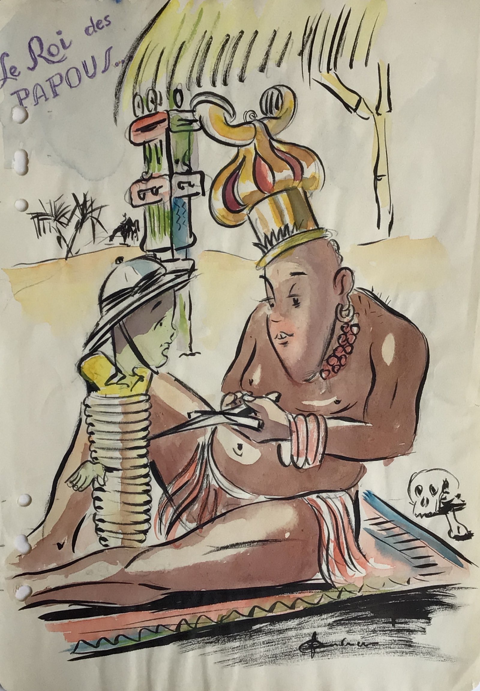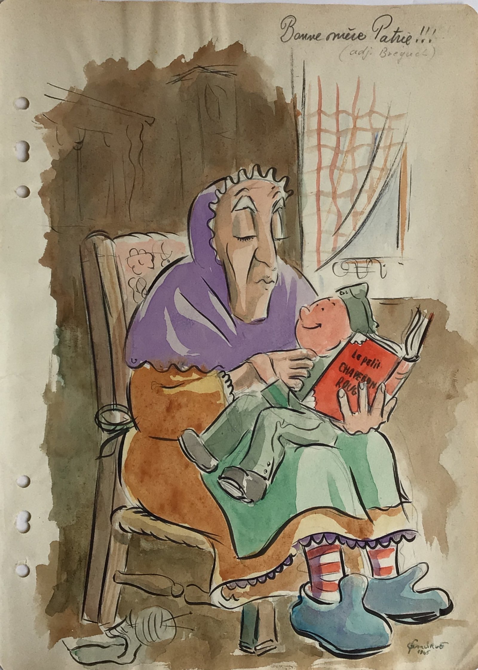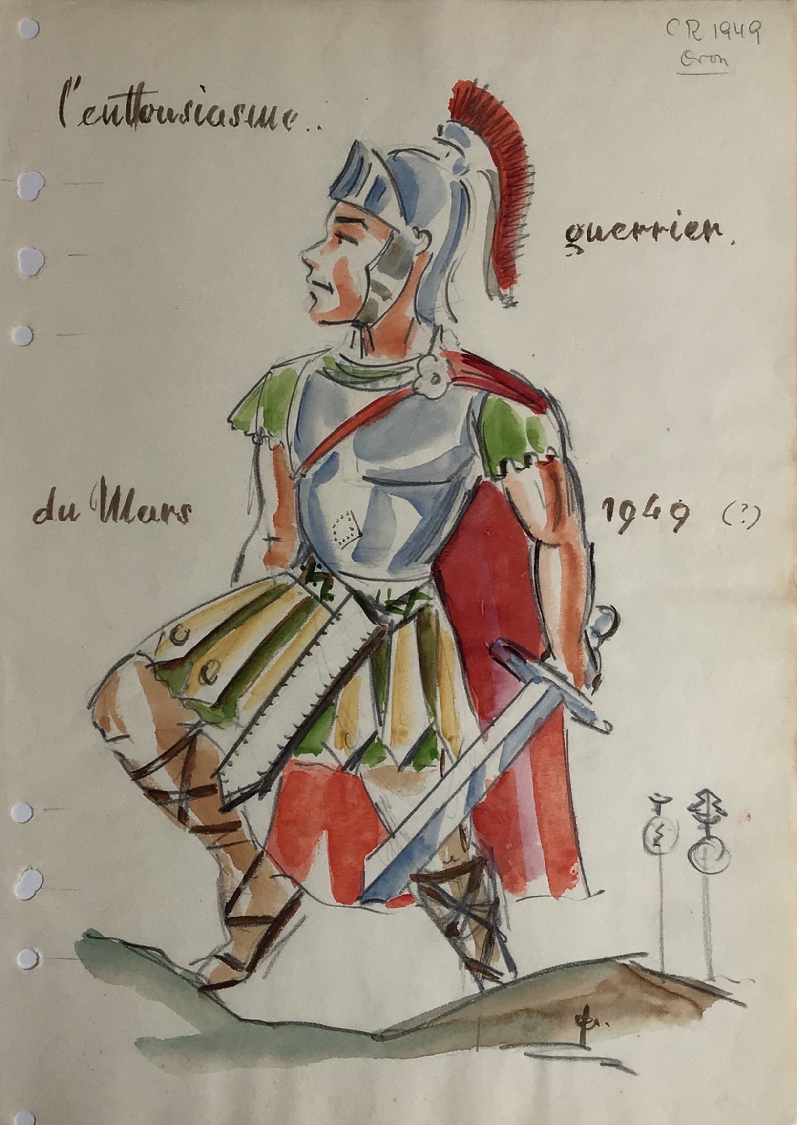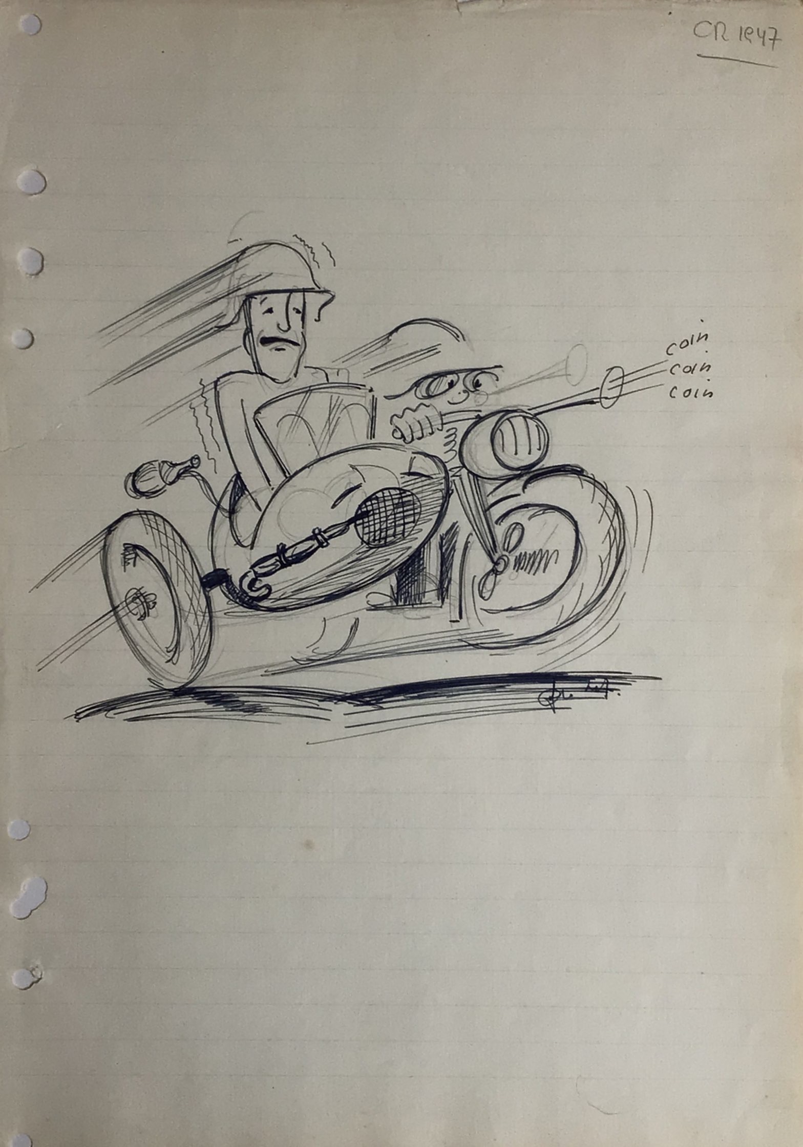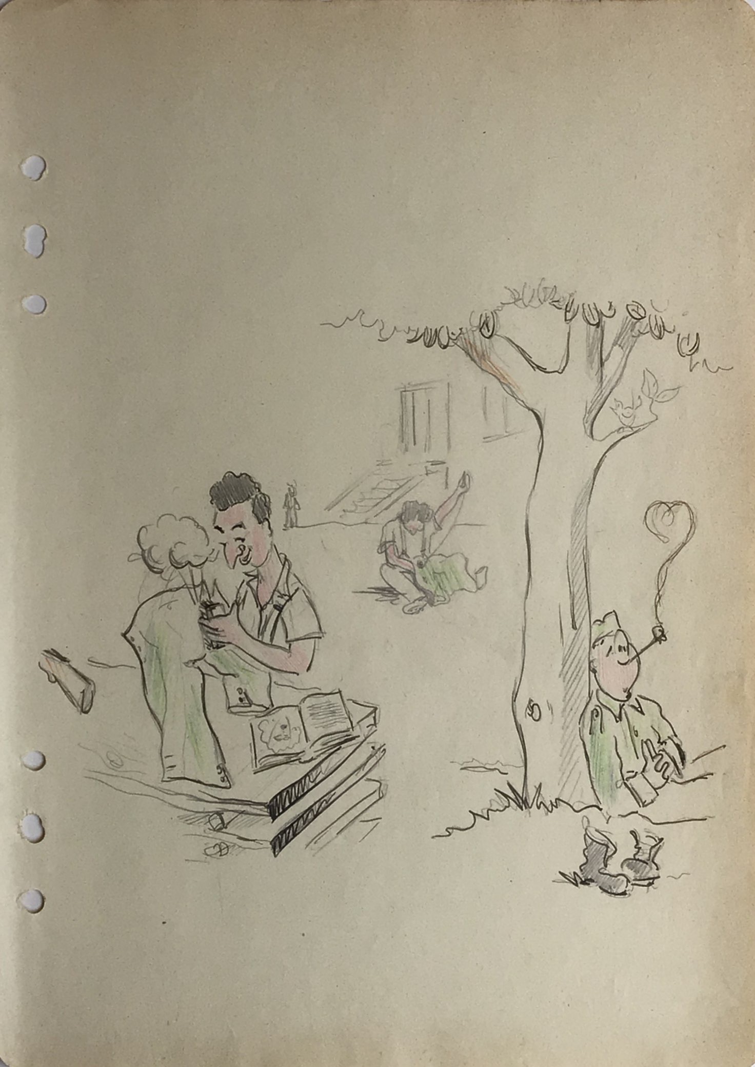 - Feuillet de divers dessins datant de 1945 à 1947 caricaturant la guerre.