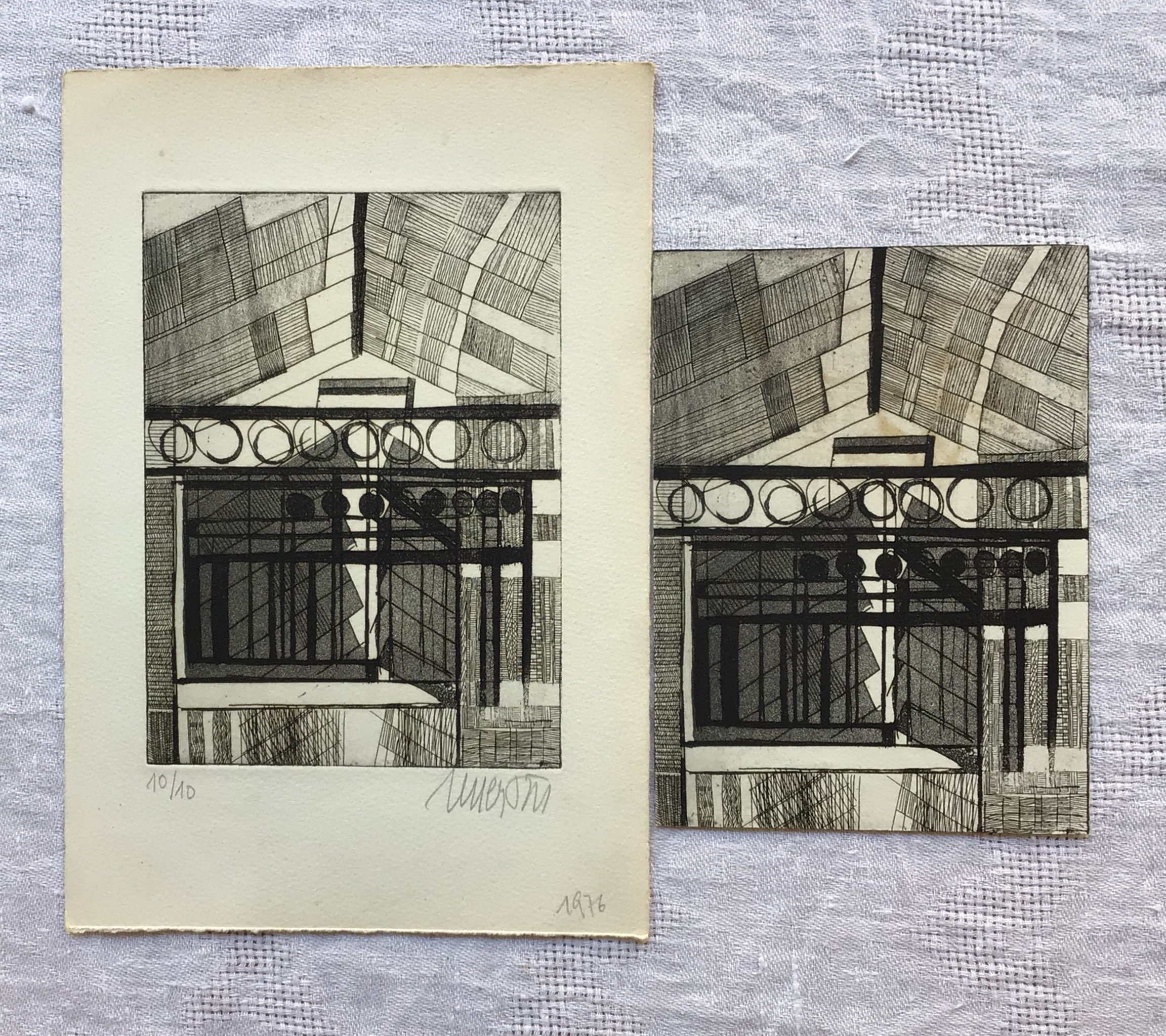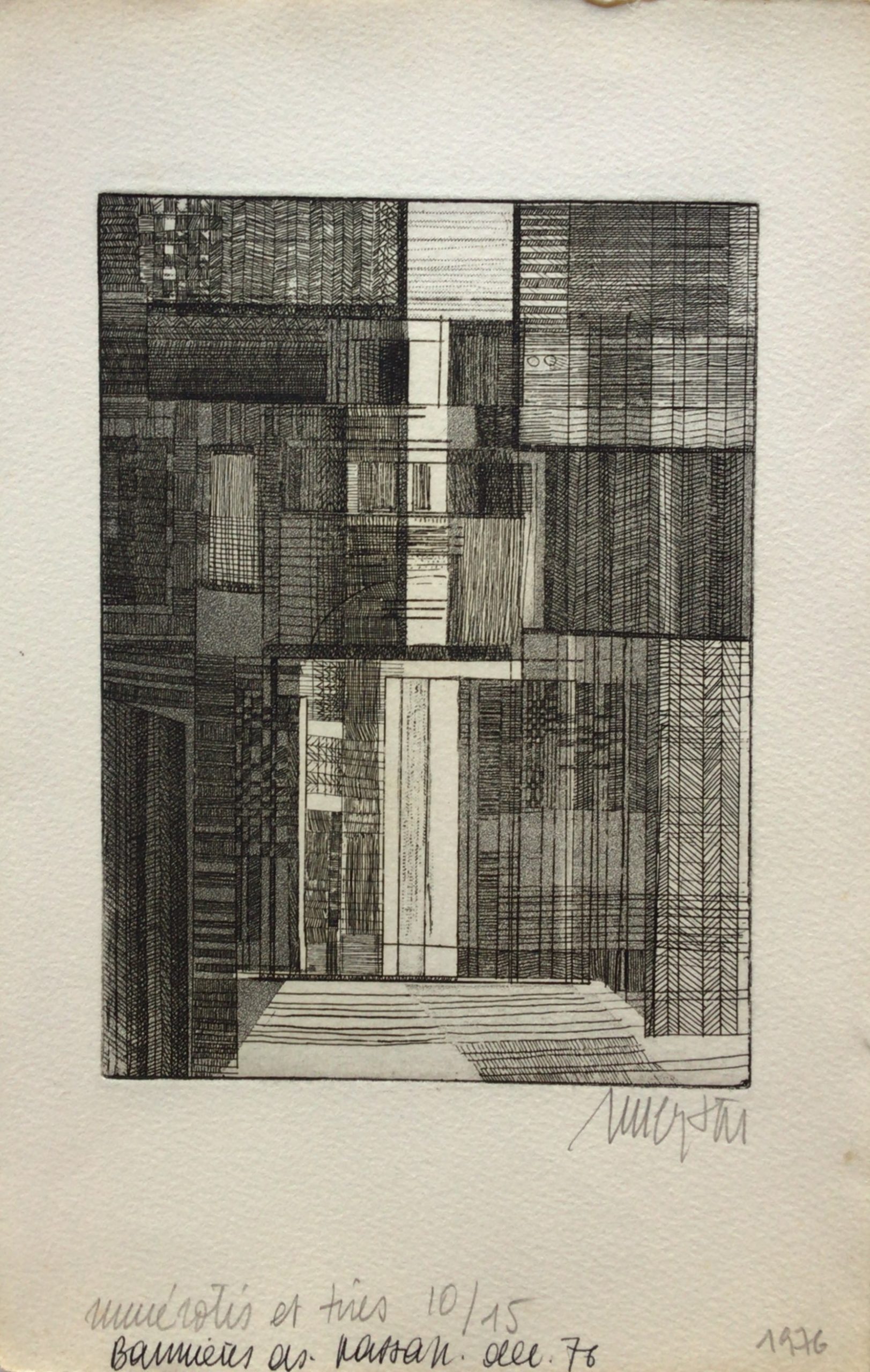 - 2 gravures aquatiques et eau-forte (25x16cm) toutes deux signées, datées « déc.76 » et titrées « Les bannières des passages » ou « Les bannières dans le passage »bd ; une pièce est justifiée « 10/15 » et l’autre comporte la mention : « numérotés et tirés 10/15 »bd