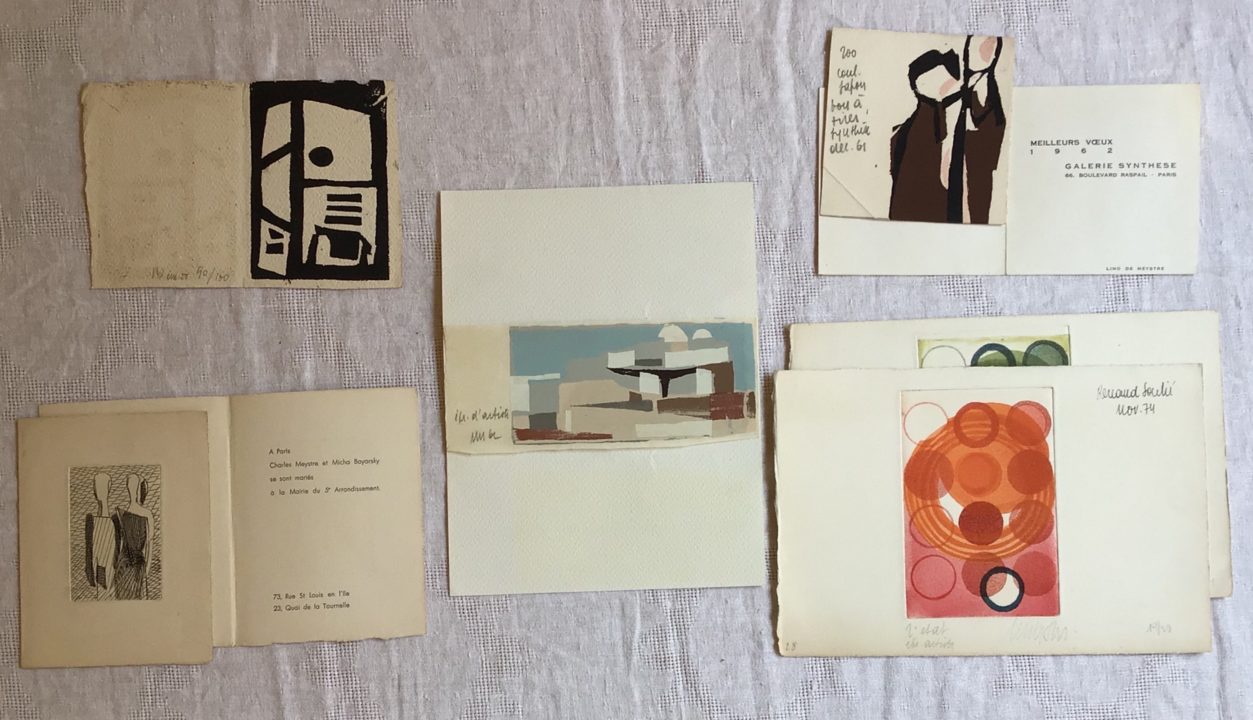 - 4 épreuves de sérigraphie (12,5x12,5cm) datées de 1961 avec inscription diverses pour la carte de voeux 1962 de la Galerie Synthèse à Paris (avec l’inscription « Lino de Meystre » sic) ; titrées « Le couple » (dans le Petit classeur noir, p. 196)