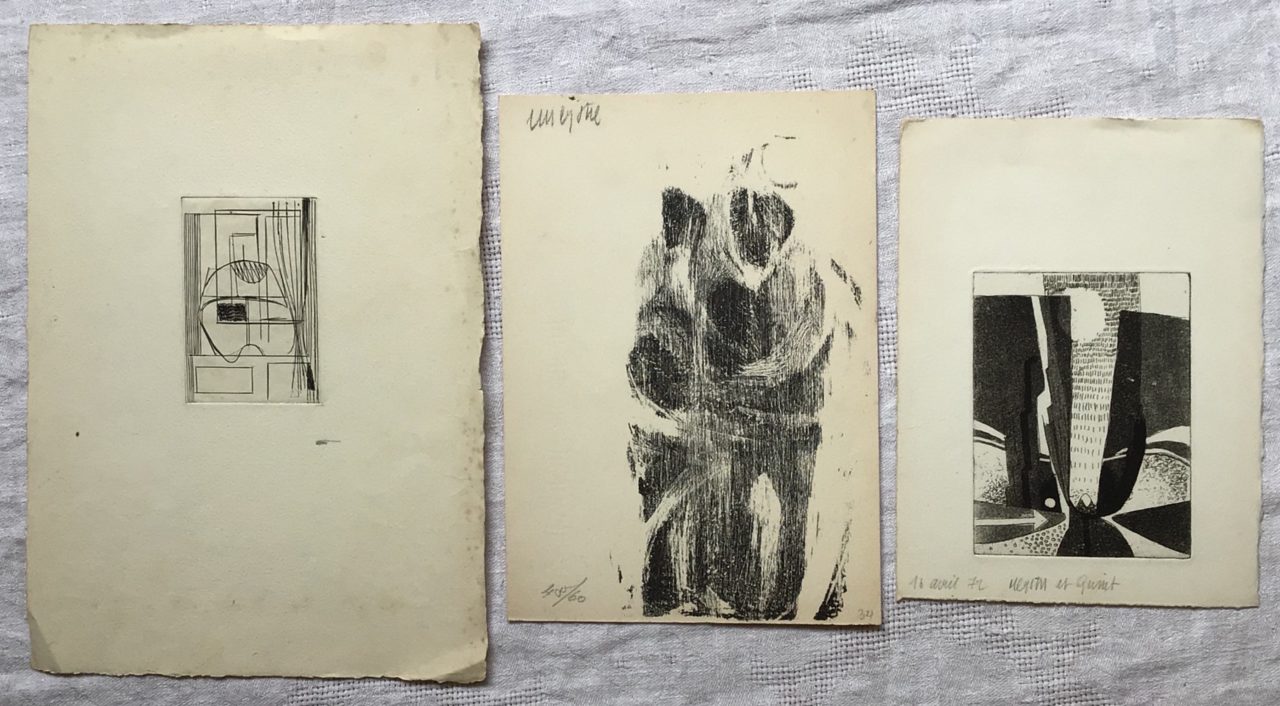 - 1 burin (28x20cm) daté 1952 de et titré « La chambre que je n’ai pas » pour Guy Weelen (Grand classeur noir, p. 106) ; avec mention au verso « tirage Leblanc ».