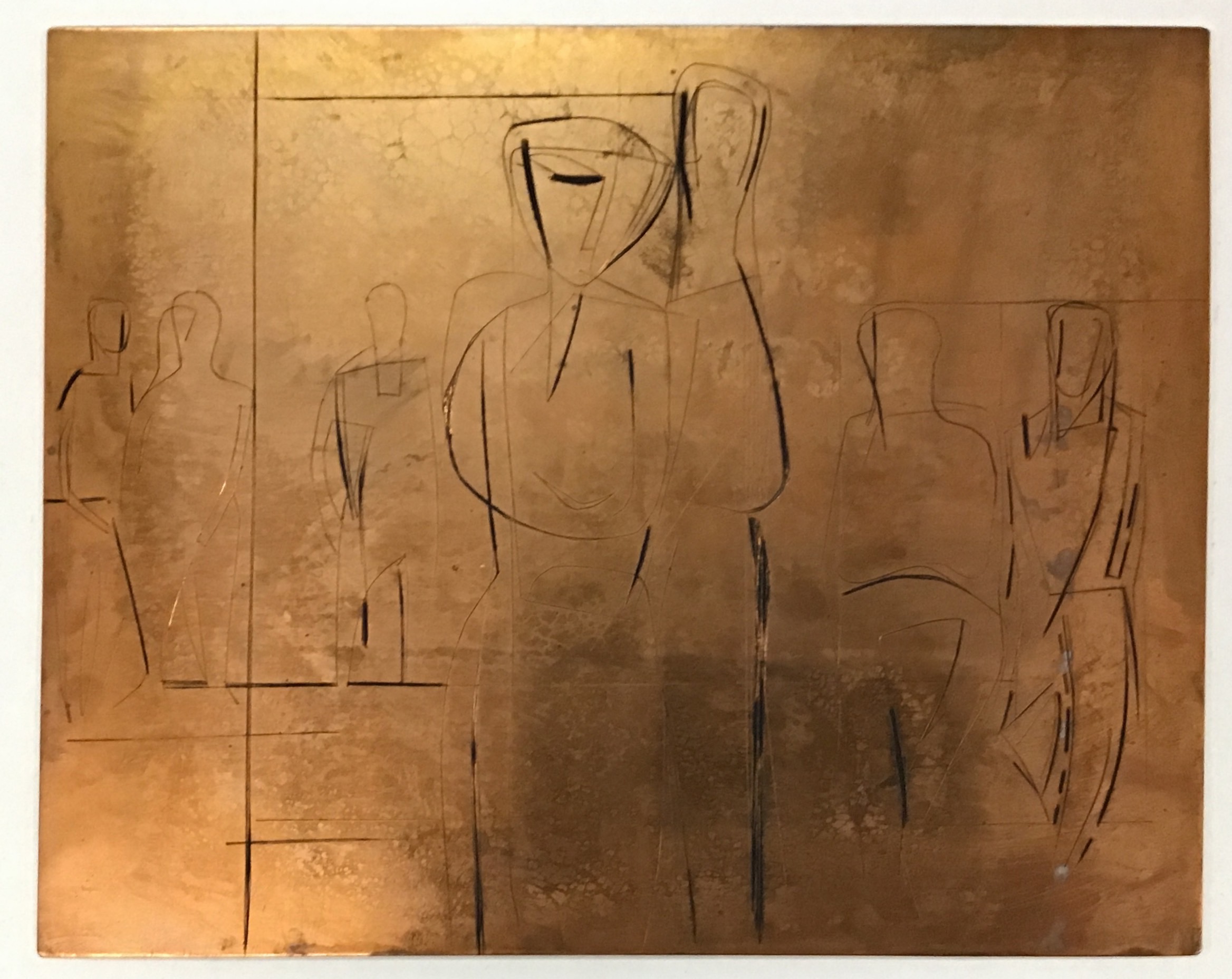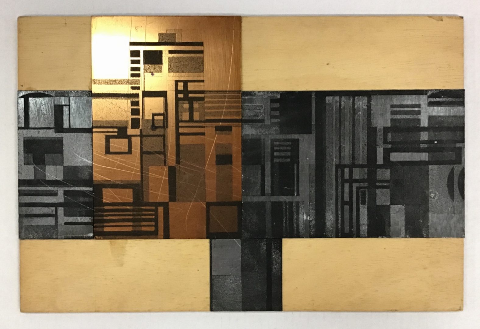- 1 cas particulier : assemblage de 4 matrices de formats différents sur fond de bois croisé (24x36cm) ; qui semble constituer une oeuvre d’art à part entière, mais il s’agit probablement d’une matrice d’impression combinée (rayures communes sur l’ensemble des matrices ; voir photo).