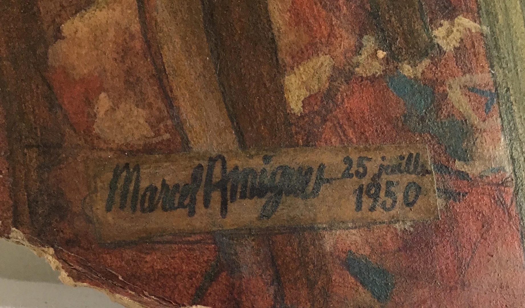 - déchirures du carton bg, hg et hd ; le manque de hd est collé au dos