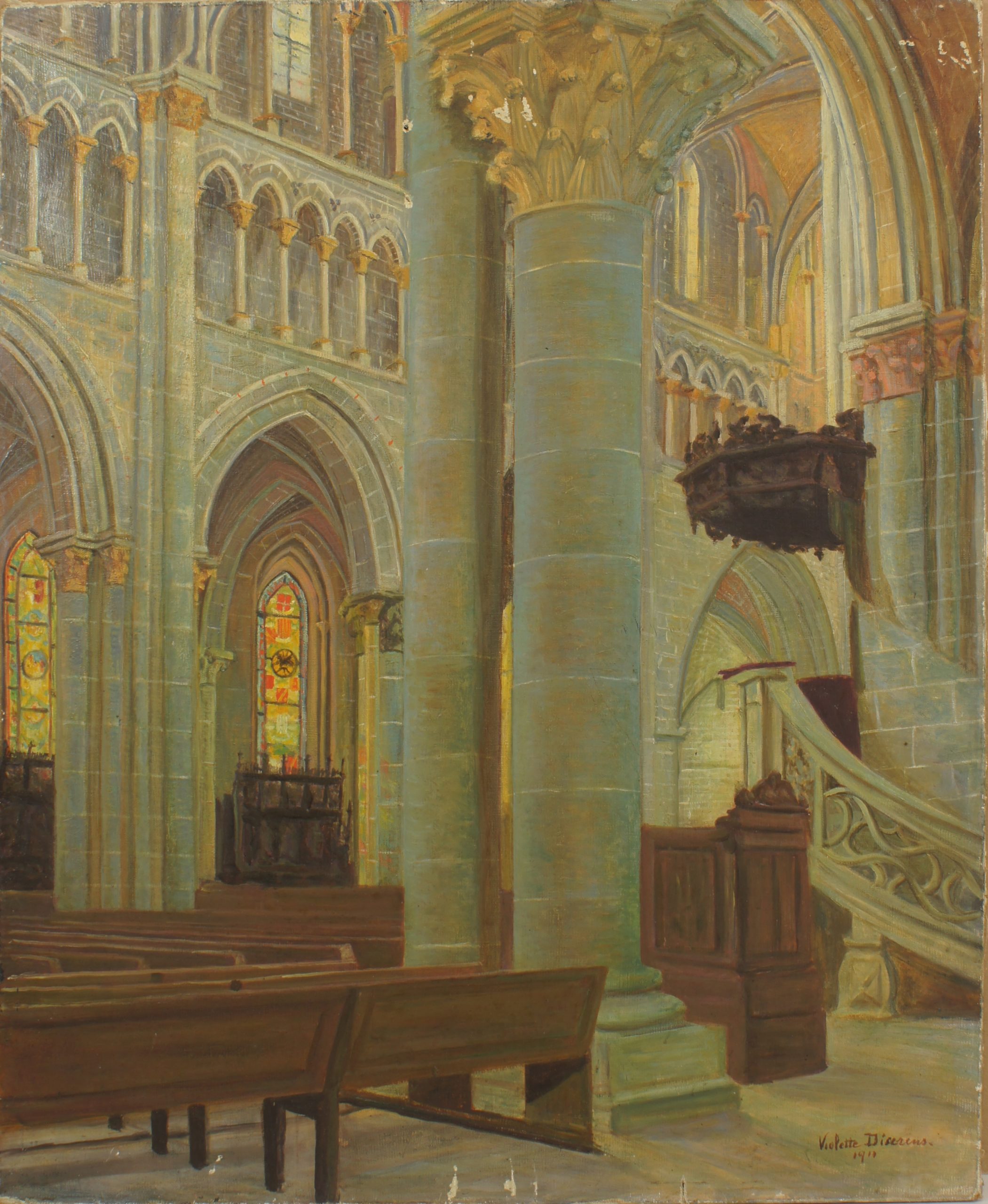 Intérieur de la cathédrale Artiste DISERENS Violette Numéro d'inventaire FAA-DV-1524 Titre inconnu Dénomination Intérieur de la cathédrale Année 1911 Dimensions sur chassis 73x60 cm Technique / Support Huile, Toile Catégories Architecture Signature / Datation "Violette Diserens / 1911" bd Remarques - plusieurs trous dans la toile dans la partie supérieure - toile visible dans la bas Agrandir l'image Découvrez l'artiste DISERENS Violette Lausanne (CH) 2 juin 1888 / 27 avril 1965 Peinture, Gravure Fonds géré par la FAA Consulter sa fiche Images complémentaires DISERENS Violette – Intérieur de la cathédrale 1911 – Huile, Toile, 73x60 cm – Architecture