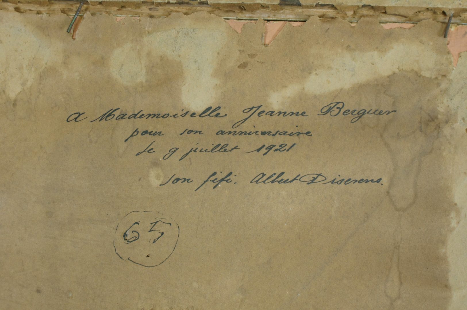 Portrait d'homme Artiste DISERENS Albert Numéro d'inventaire FAA-DA-1654 Titre inconnu Dénomination Portrait d'homme Année 1921 Dimensions sur chassis 50x37 cm Technique / Support Huile, Ardoise Catégories Portrait Signature / Datation "A. Diserens/1921" Remarques Dédicacé A Mademoiselle Jeanne Berguer pour son anniversaire, le 9 juillet 1921, son fifi Albert Diserens Agrandir l'image Découvrez l'artiste DISERENS Albert Lausanne (CH) 24 décembre 1891 / 9 mars 1967 Fonds géré par la FAA Consulter sa fiche Images complémentaires DISERENS Albert – Portrait d'homme 1921 – Huile, Ardoise, 50x37 cm – Portrait