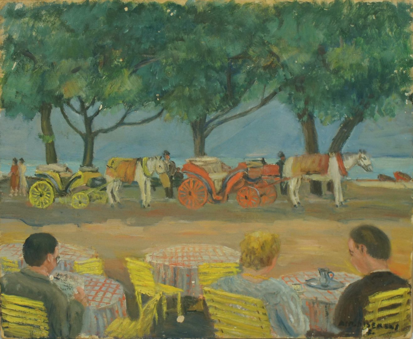 Calèches au bord du lac Artiste DISERENS Albert Numéro d'inventaire FAA-DA-1667 Titre inconnu Dénomination Calèches au bord du lac Dimensions sur chassis 38x46 cm Technique / Support Huile, Panneau, Bois aggloméré Catégories Scène de genre Signature / Datation "Alb. Diserens" bd Remarques - Date illisible inscrite sous signature - voir étude AA-DA1950 Agrandir l'image Découvrez l'artiste DISERENS Albert Lausanne (CH) 24 décembre 1891 / 9 mars 1967 Fonds géré par la FAA Consulter sa fiche