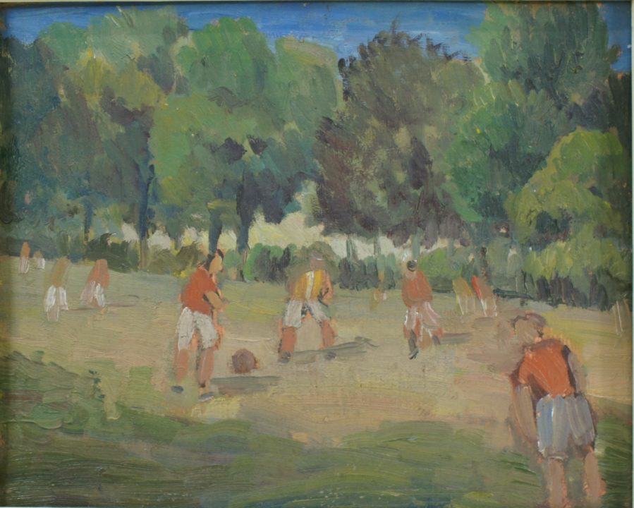 Joueurs de foot dans un parc Artiste DISERENS Albert Numéro d'inventaire FAA-DA-1672 Titre inconnu Dénomination Joueurs de foot dans un parc Dimensions sur chassis 32x40.5 cm Technique / Support Huile, Ardoise Catégories Scène de genre Signature / Datation sans Remarques - autoportrait au dos Agrandir l'image Découvrez l'artiste DISERENS Albert Lausanne (CH) 24 décembre 1891 / 9 mars 1967 Fonds géré par la FAA Consulter sa fiche Images complémentaires DISERENS Albert – Joueurs de foot dans un parc – Huile, Ardoise, 32x40.5 cm – Scène de genre