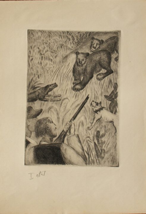 Chasse à l'ours Artiste DISERENS Violette Numéro d'inventaire FAA-DV-1750 Titre inconnu Dénomination Chasse à l'ours Dimensions sur chassis 25x19 cm Technique / Support Gravure Catégories Scène de genre Signature / Datation sans Remarques - plaque 16 x 11 cm - illustration pour le livre ""Robinson suisse" de Jean-David Wyss, édité chez Kaeser Agrandir l'image Découvrez l'artiste DISERENS Violette Lausanne (CH) 2 juin 1888 / 27 avril 1965 Peinture, Gravure Fonds géré par la FAA Consulter sa fiche